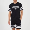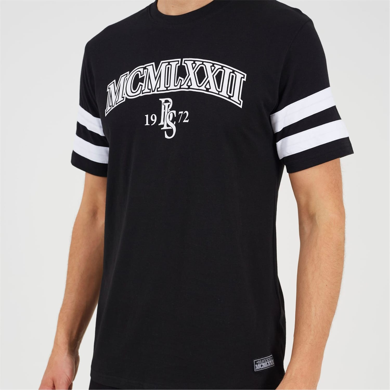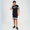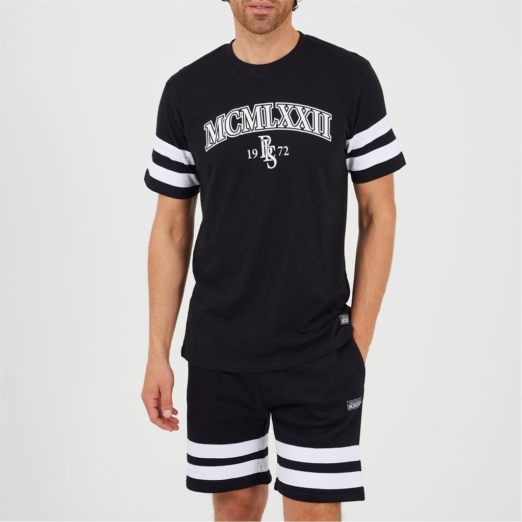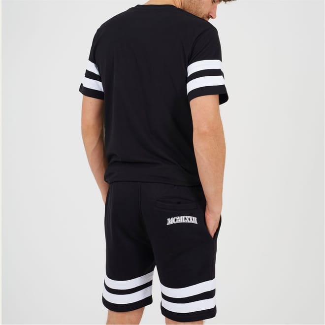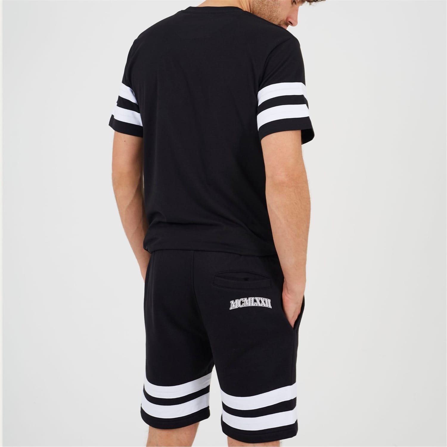 Brave Soul Men’s Black T-Shirt & Shorts Set. Contrast colour stripe panels to sleeves and legs. Print to center chest and back of the shorts, woven label detail to thigh. Shorts include two waist pockets and an adjustable drawstring waist. -