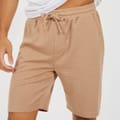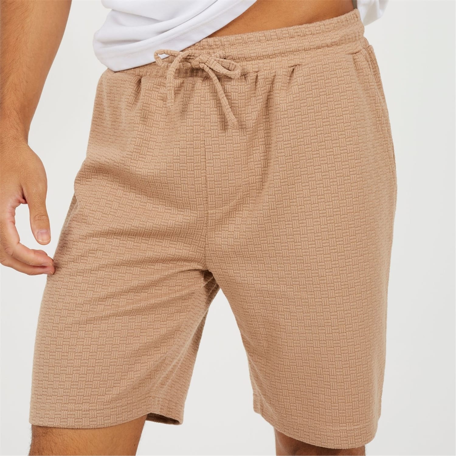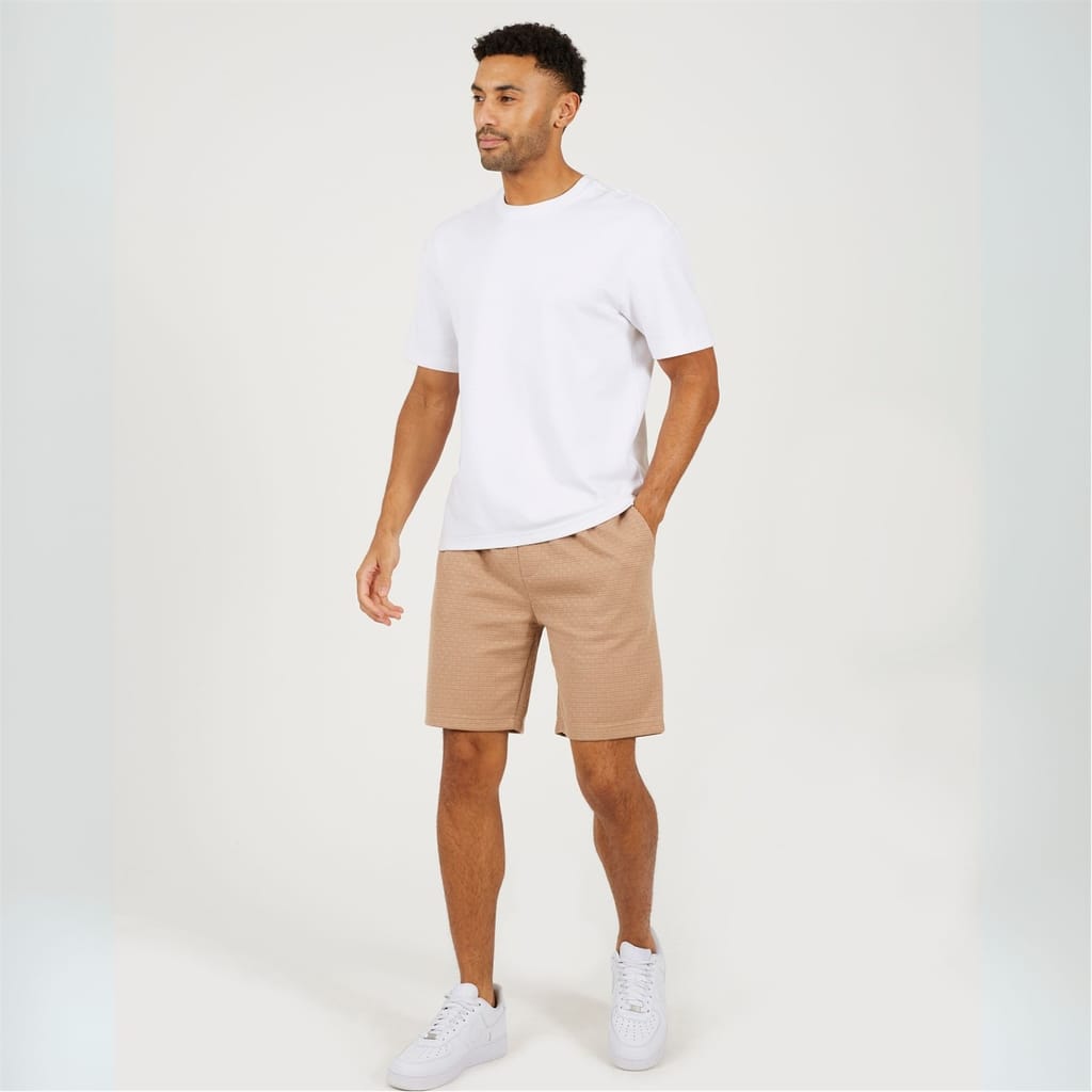 Brave Soul Men’s Textured Shorts. All-over textured fabric with side-entry pockets, a back patch pocket, and an elasticated waist with drawcord. Standard fit with single-stitch detail on the fly. -