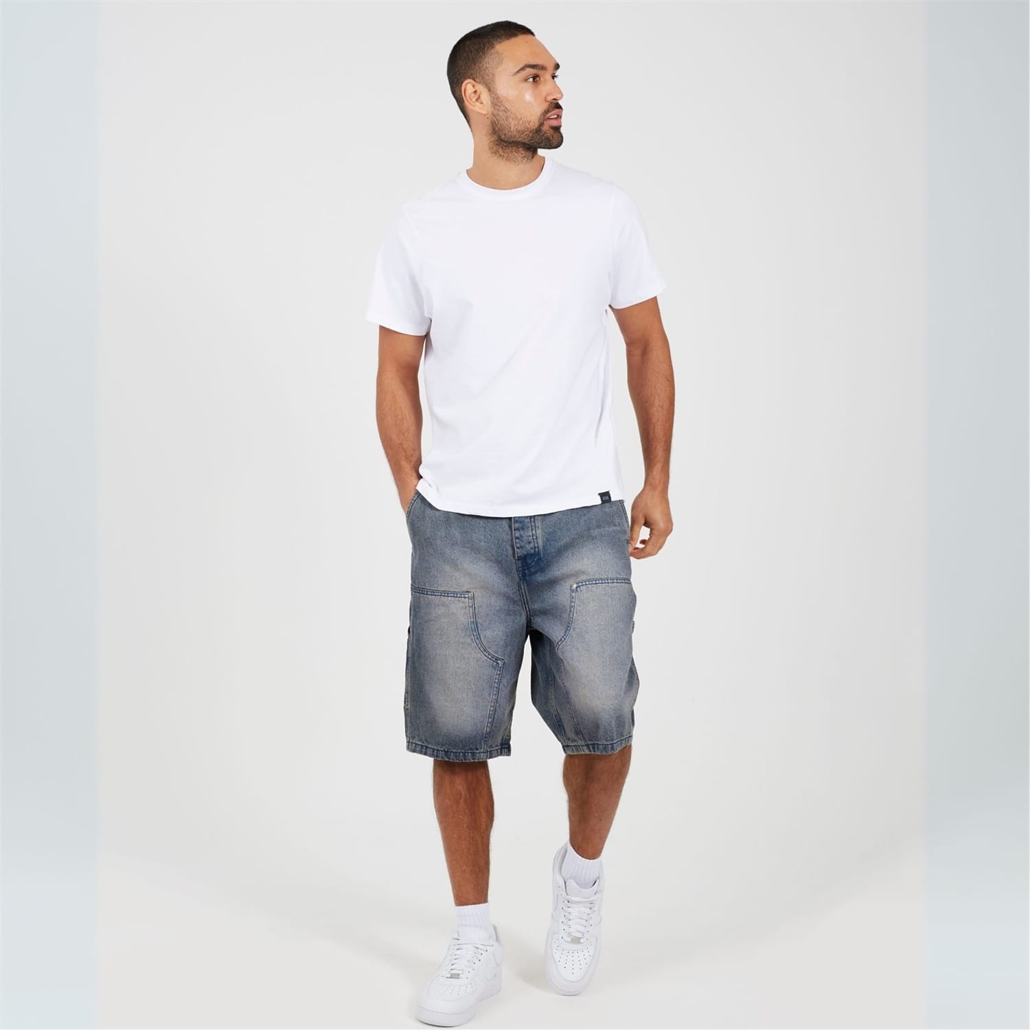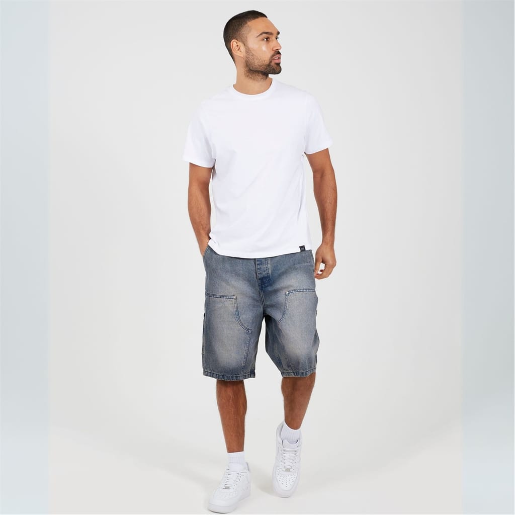 Brave Soul Men’s Loose Fit Denim Carpenter Shorts. Mid blue wash denim with a relaxed fit for comfort. Features carpenter pockets and strap detail with a classic button waist. -