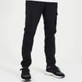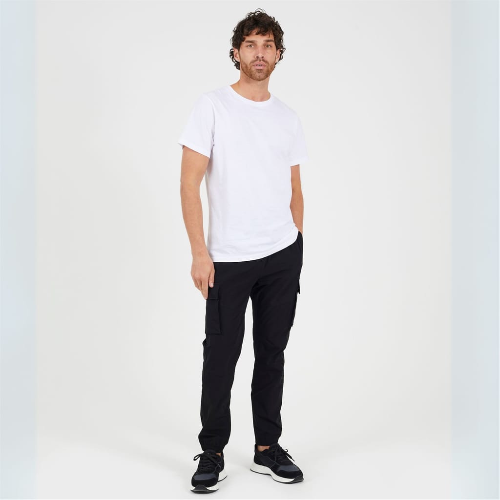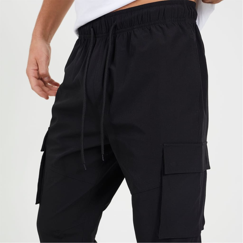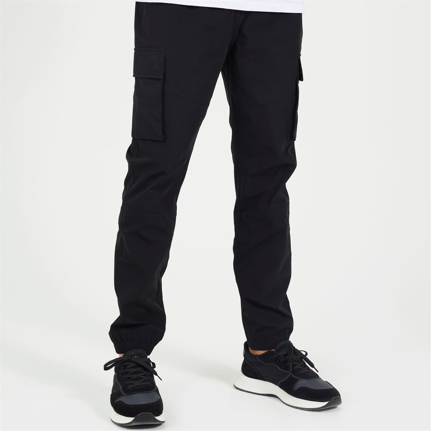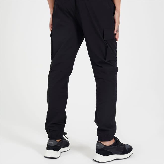 Brave Soul Men’s Black Cargo Pants. Solid Black cargo pants with elasticated waist and drawstring. Elasticated cuffs and cargo pockets to thigh. -
