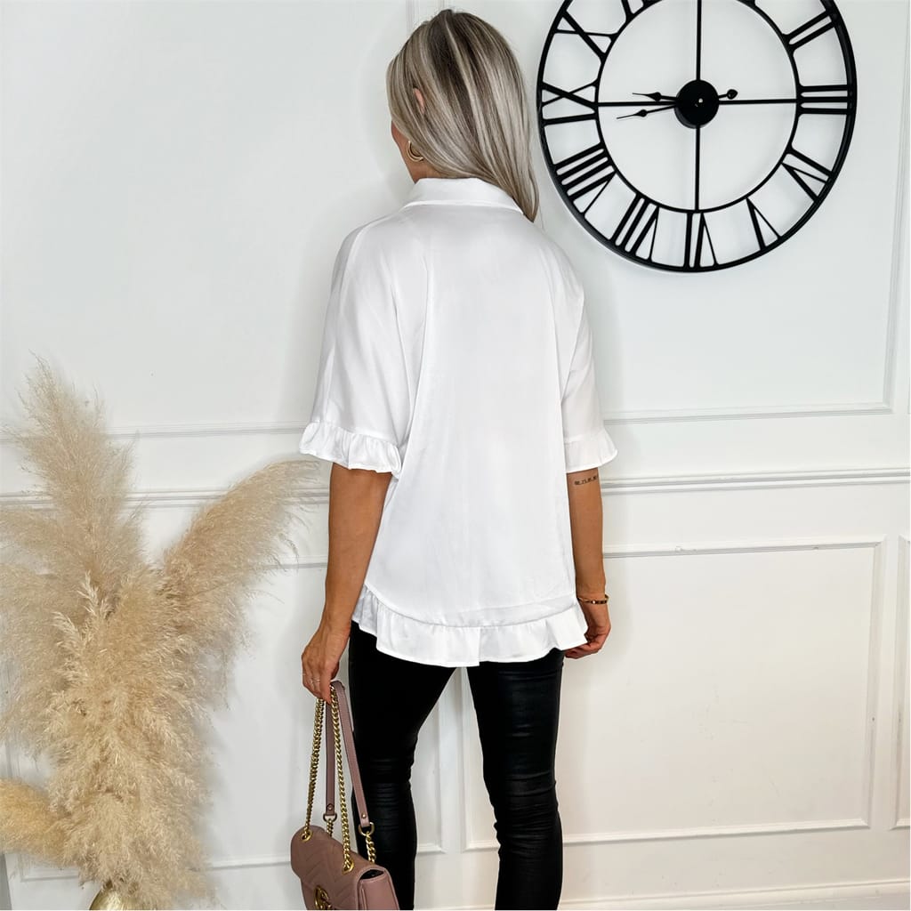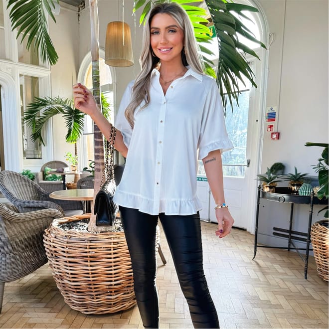 Our Cream Frill Detail Gold Button Front Shirt is a wardrobe staple and will be your go-to this summer. Featuring a classic shirt collar, short sleeves with a frill detail, gold button front and frill hem. Pair with denim shorts, sandals and a cute tote bag for the perfect summer day look.