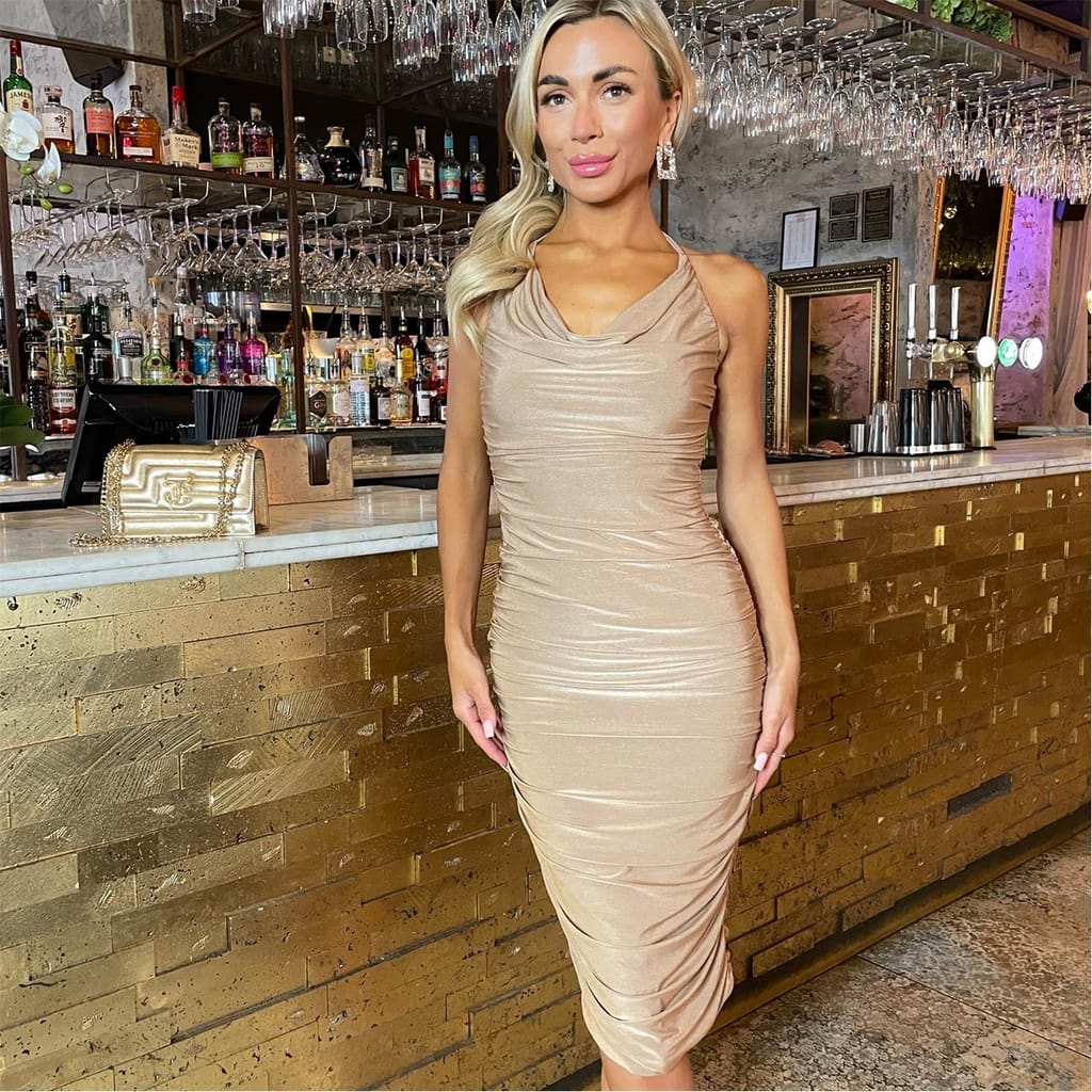 Our Stone Tie Halter Neck Ruched Midi Dress is the perfect party piece! Featuring an adjustable tie halter neck, ruched detail and slinky fabric with bodycon fit. Simply pair with strappy heels and statement accessories to complete the look!