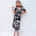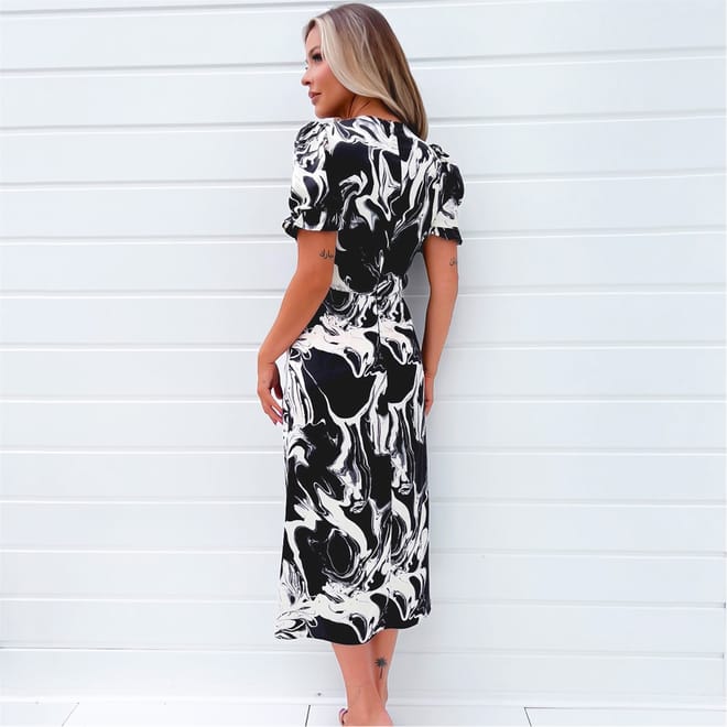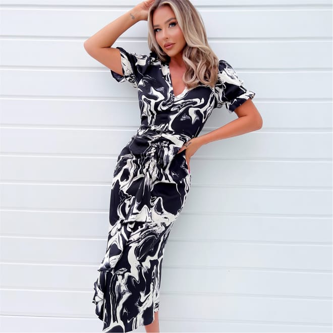 Our Black And Cream Printed Frill Front Midi Dress is right on trend this season! Featuring a v neck, ruched front and elasticated cuff short sleeves! It's perfect for that upcoming special occasion! Simply pair with heels for a sophisticated look!