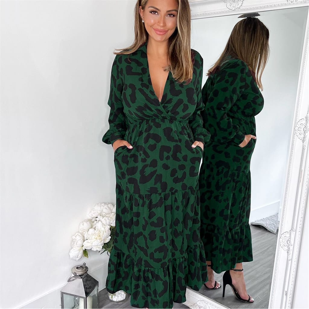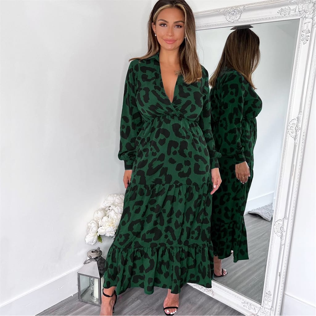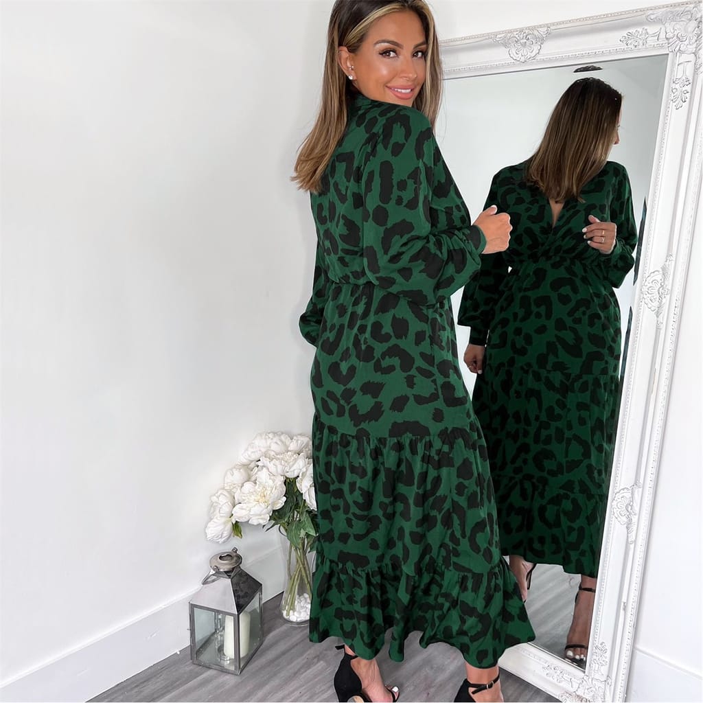 Our Green Leopard Print Long Sleeve Smock Midi Dress is a must have this season! Featuring long button fastened cuff sleeves, a shirt style collar, wrap top and smock style tiered midi dress! Style for day or night with some heels or boots and a leather look jacket.