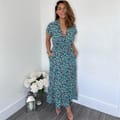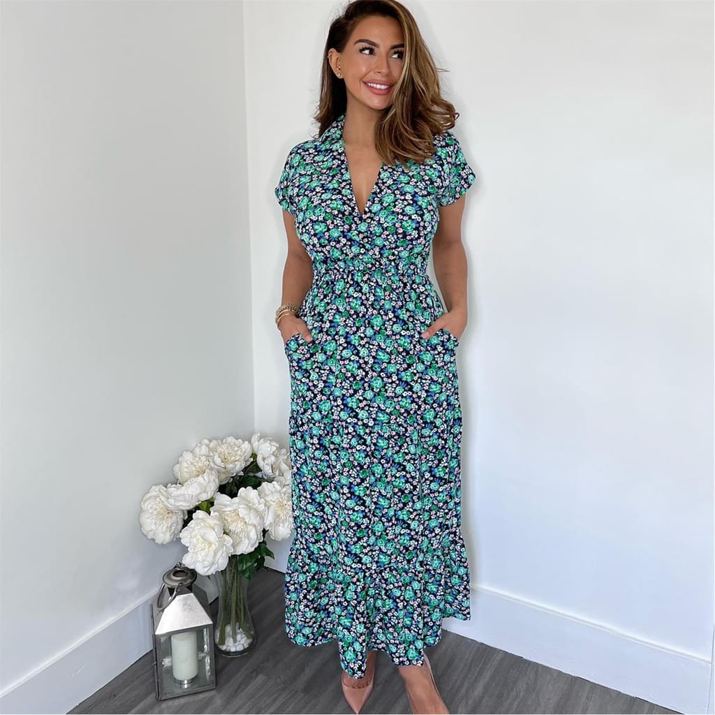 Our Navy Floral Print Short Sleeved V-Neck Midi Smock Dress is a wardrobe must have. Featuring a v neck cross over style top with short sleeves, a layered swing style skirt and pockets! Pair with some cute trainers and a cute headband to complete the look!