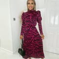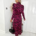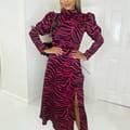 Stand out in our Pink Zebra Print Long Puff Sleeve Midi Dress! Featuring long puff shoulder long sleeves, a split skirt and a zip up back. Simply pair with strappy heels to complete the look!