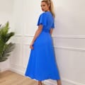 Stay sophisticated in this Blue Short Sleeve Belted Wrap Midi Dress. Featuring short butterfly sleeves, a gold buckle belt, and a zip up back. Simply pair with gold heels and accessories to complete the look.