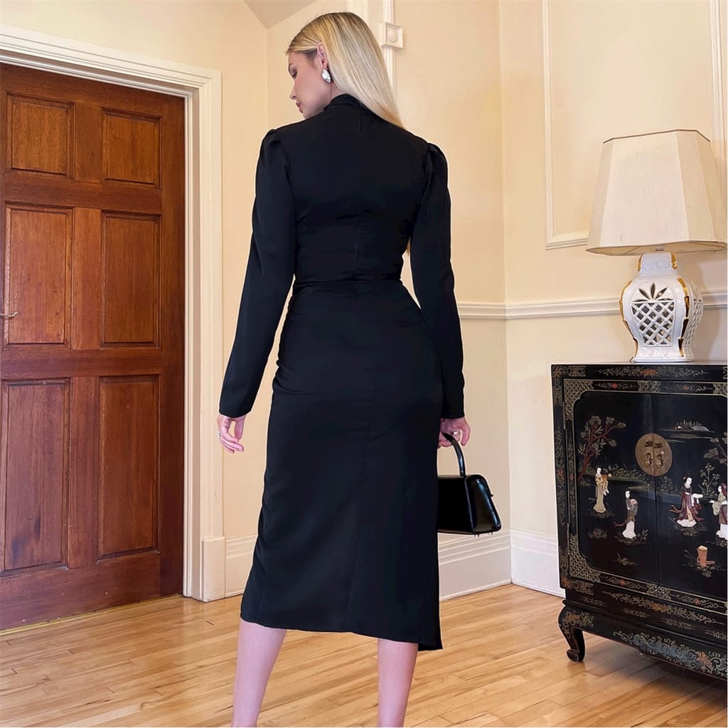 Look sophisticated in this occasion must-have High Knot Neck Wrap Midi Dress. Featuring a high neck with knot detail, long sleeves, zip up back and wrap midi length skirt with ruched side. Dress up this midi with killer heels and a matching bag.