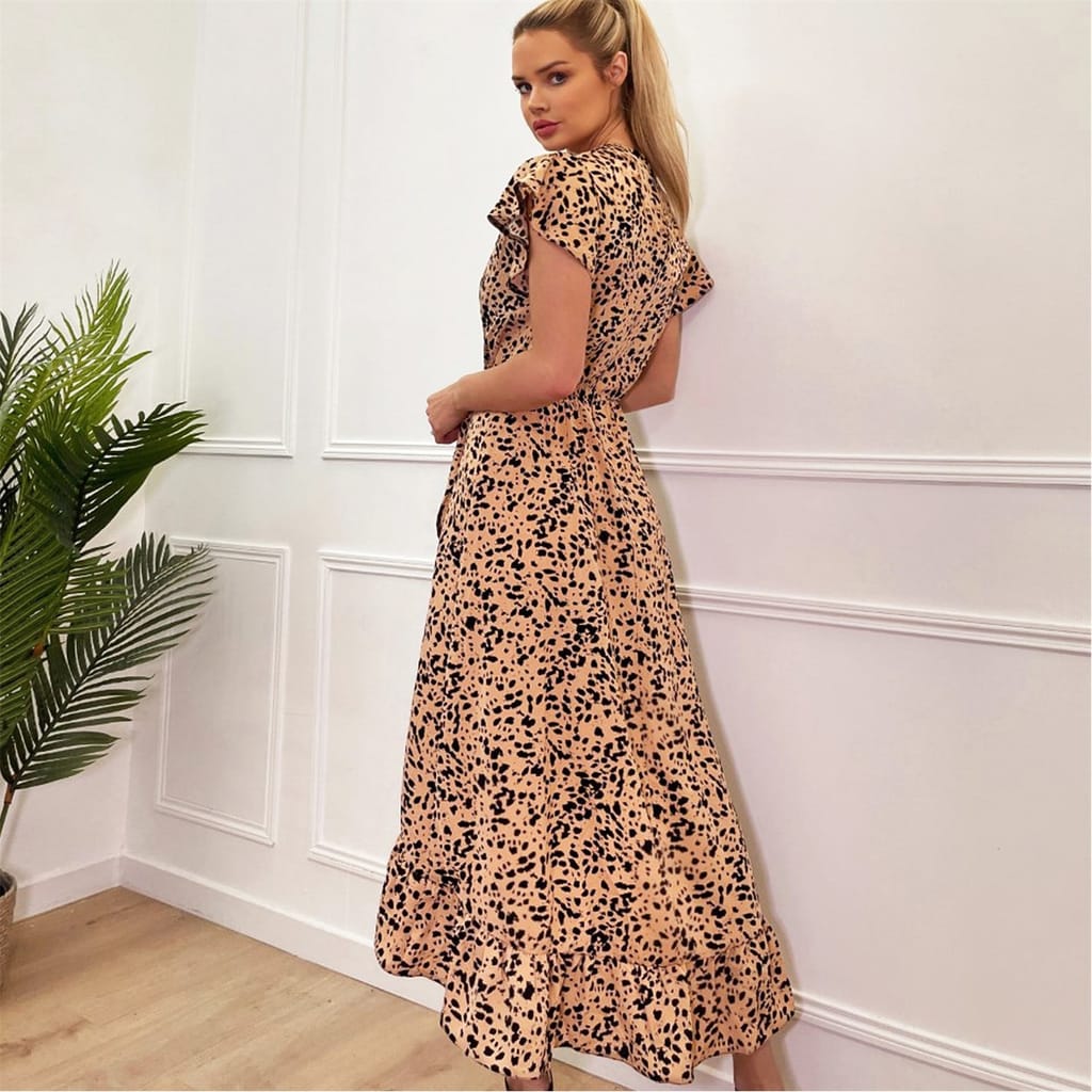 Our Peach And Black Printed Wrap Over Frill Hem Short Sleeve Midi Dress is the perfect occasion dress! Featuring a wrap top and skirt with frill edging and sleeves, a dipped hem and zip up back. Simply pair with heels and a clutch to complete the outfit!