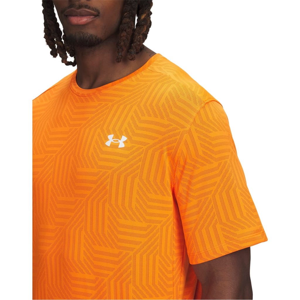The Under Armour Geotessa top is designed for performance with a regular fit and short sleeves. Featuring a crew neck, this top showcases a striking geometric pattern, making it a stylish choice for active wear. -