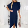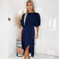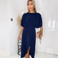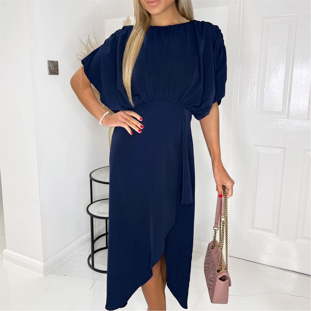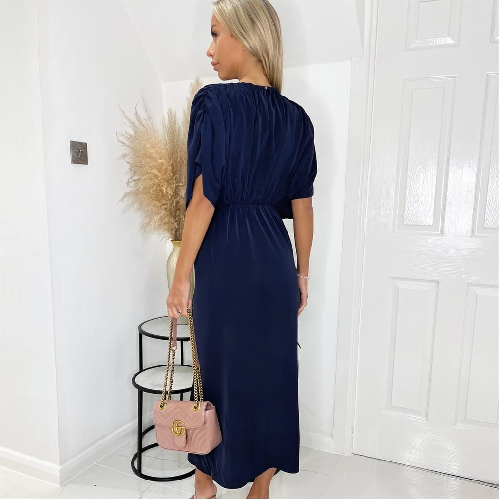 Look and feel gorgeous in our Navy Batwing Top Wrap Skirt Midi Dress. Featuring a ruched shoulder full top and a wrap midi length skirt . Style with strappy heels and minimal jewellery to complete the look.