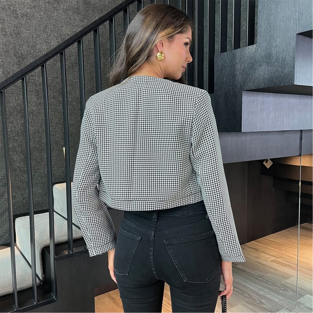 Add a touch of modern sophistication to your wardrobe with our Black And White Houndstooth Double Breasted Cropped Jacket. Featuring a classic double breasted silhouette, cropped length and gold buttons. Wear this tailored piece with jeans to elevate a casual outfit, or wear it with one of our houndstooth 2 in 1 lines to create a chic occasion look.