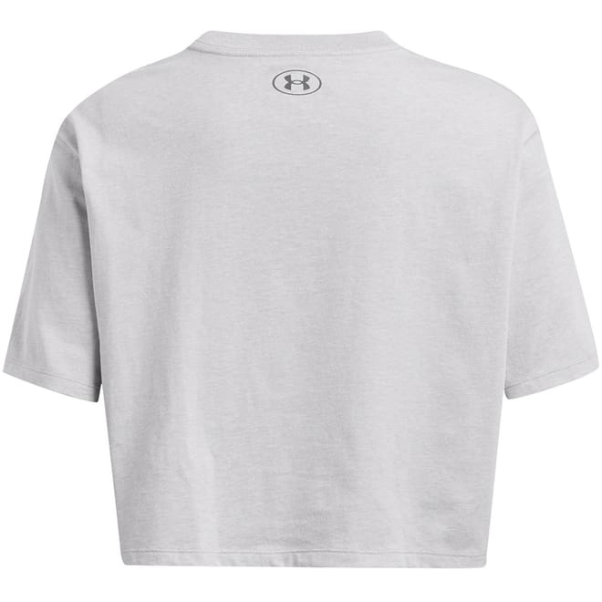 This Under Armour cropped top features a boxy fit and a crew neck, designed for performance. With its solid pattern and short sleeves, it offers a sleek and functional style. -