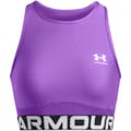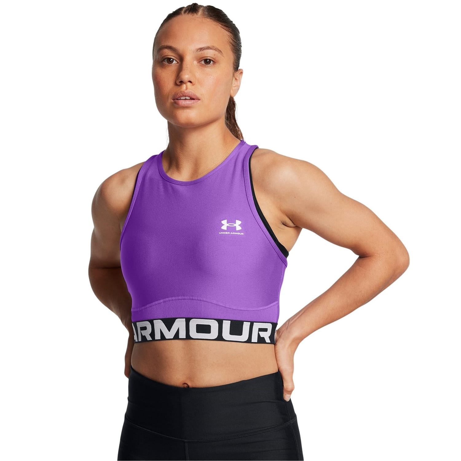 This Under Armour top features a sleeveless design with a crew neck, offering a snug fit. The cropped length and solid pattern make it a versatile addition to your wardrobe. Crafted with HeatGear technology, it ensures comfort during active pursuits. The top is embellished with a logo, adding a touch of brand identity. -
