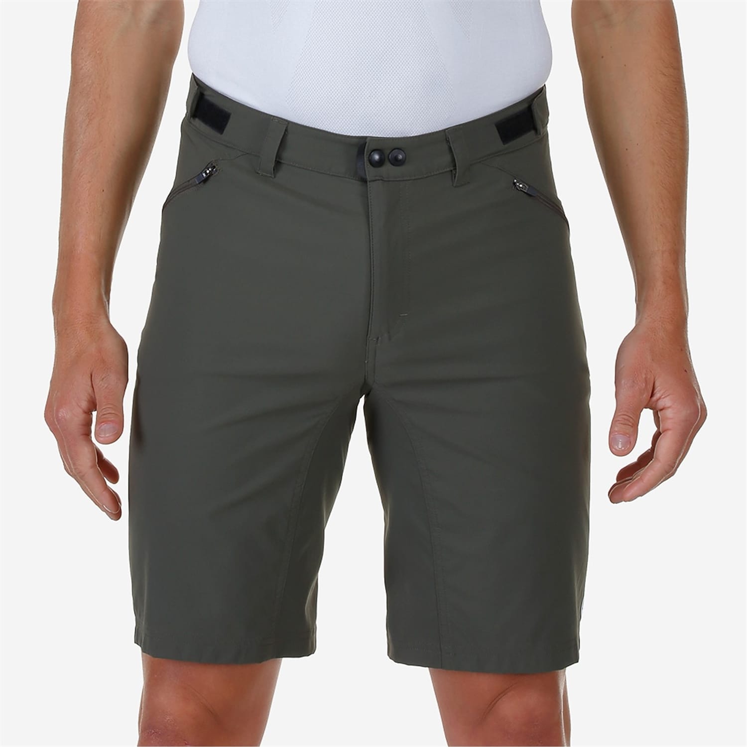 - The Ostiglia 2 men’s shorts feature two zippered front pockets and velcro side-adjusters at the waist for a customizable fit. The physiological front zip closure adds practicality. Reflective details ensure increased visibility during low-light conditions.