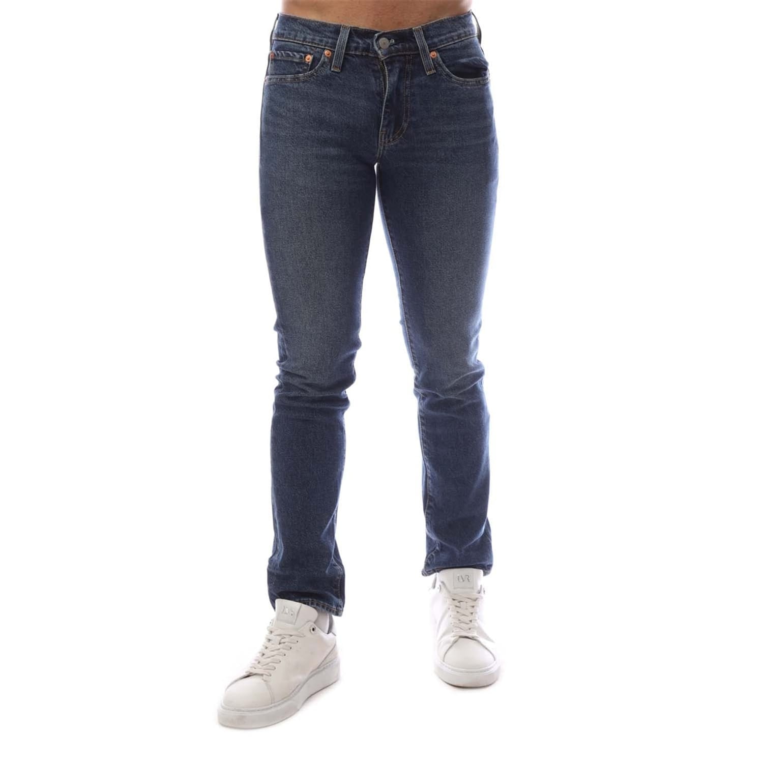 Levis jeans feature a slim fit with a classic five-pocket design. The wash pattern adds a timeless appeal, while the zip fly and front button closure ensure a secure fit. Belt loops provide versatility for accessorizing. Embellished with rivets and detailed stitching, these jeans offer both style and functionality. -