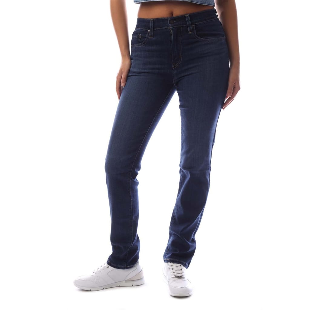 Levis jeans feature a classic five-pocket design with a straight fit. The jeans are equipped with a zip fly, front button, and belt loops for a secure fit. Embellished with front, back, and coin pockets, along with detailed stitching, these jeans offer both style and functionality. -