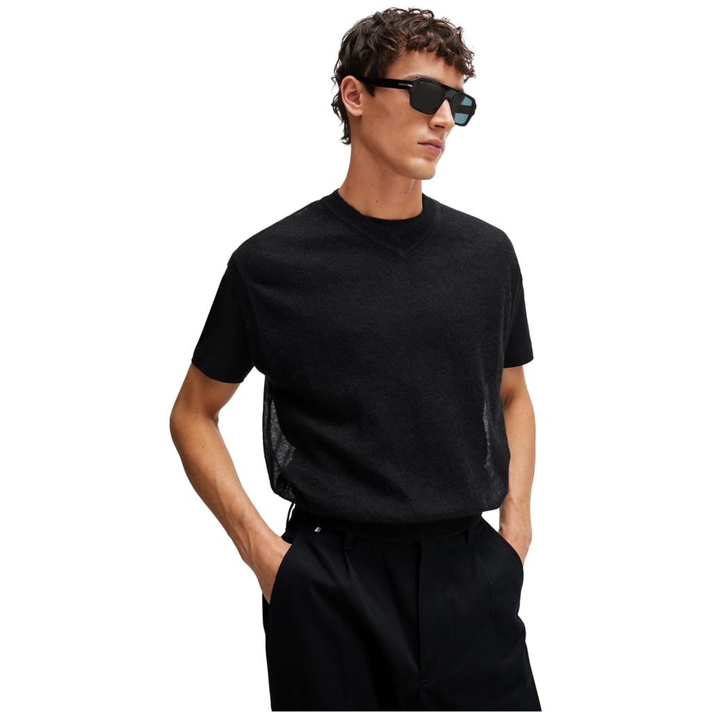 This Boss top is crafted from a knit fabric, offering a solid pattern and a regular fit. It features a classic crew neck and short sleeves, making it a versatile addition to any wardrobe. -