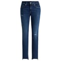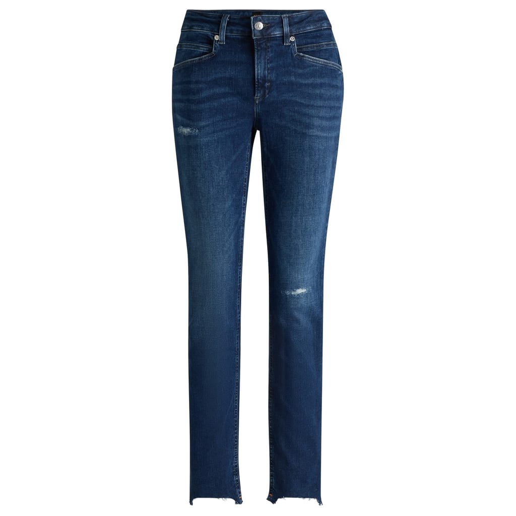 Boss jeans feature a slim fit with a five-pocket design and distressed style. The jeans have a zip fly, front button, and belt loops for secure closure. Embellished with pockets, including coin, front, and back pockets, along with distinctive stitching and a distressed hem. The wash pattern and whiskers add a unique touch to these stylish jeans. -