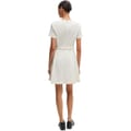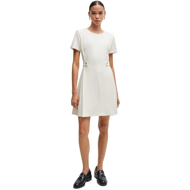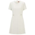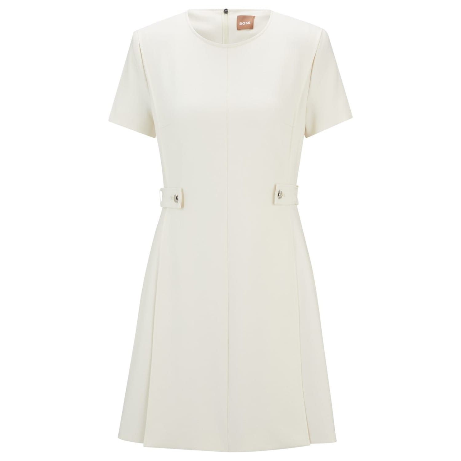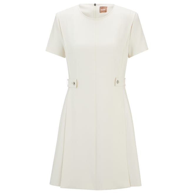 This Boss mini A-line dress features a solid pattern with a crew neck and short sleeves. The dress is designed with a back zipper closure and a straight hemline, offering a regular fit. It is adorned with stitched detail and panel embellishments, adding a touch of sophistication to its classic silhouette. -