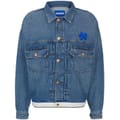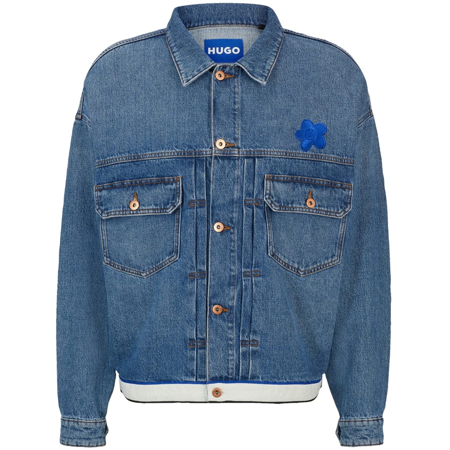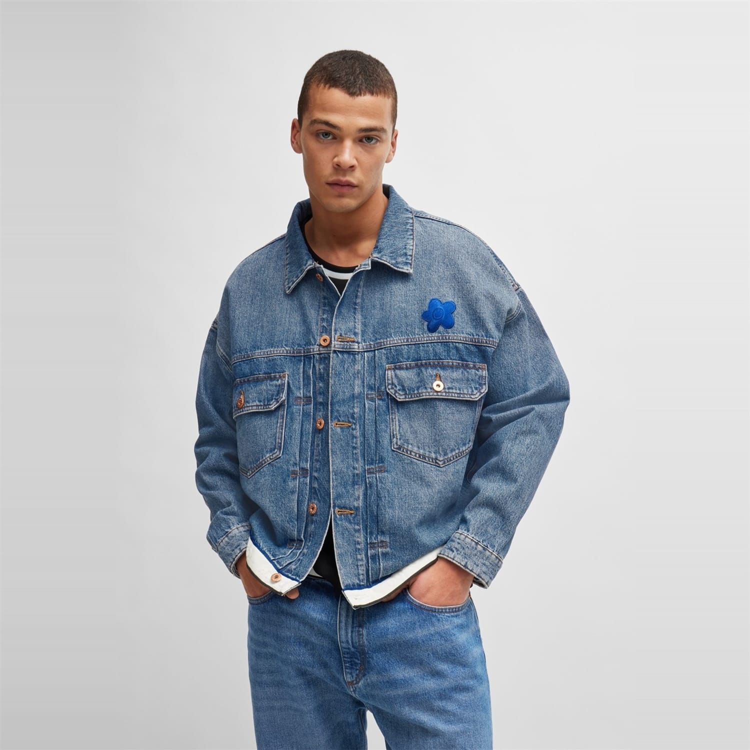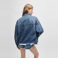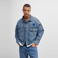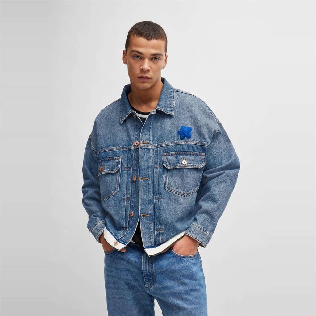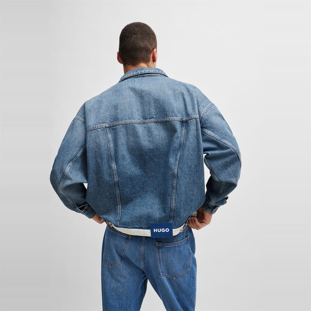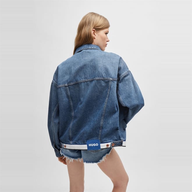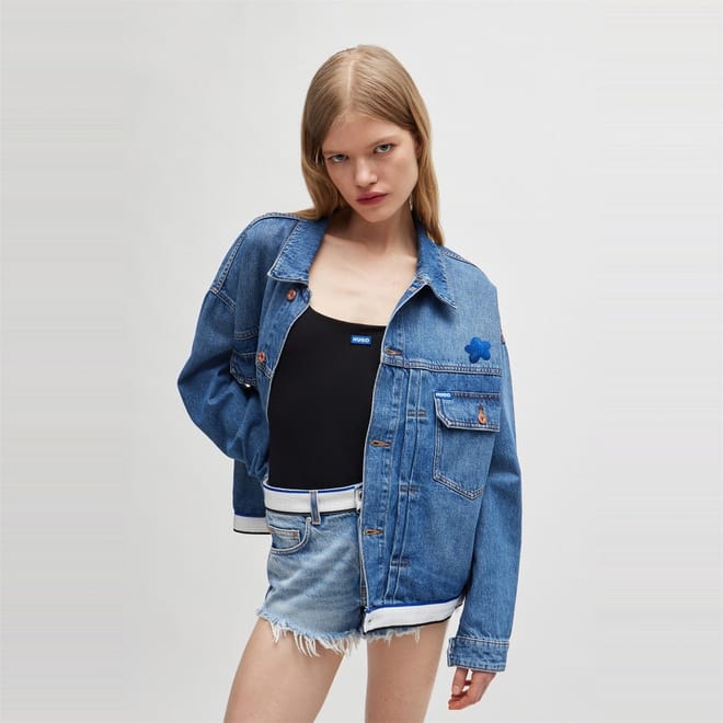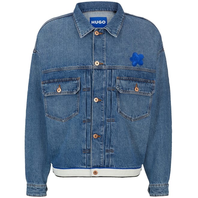This Hugo denim jacket features a solid pattern and a shirt collar, offering a classic look. The slim fit and short length provide a modern silhouette, while the button closure and straight hem ensure a neat finish. Embellished with a chest pocket and a logo patch, this jacket combines style and functionality. -