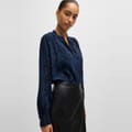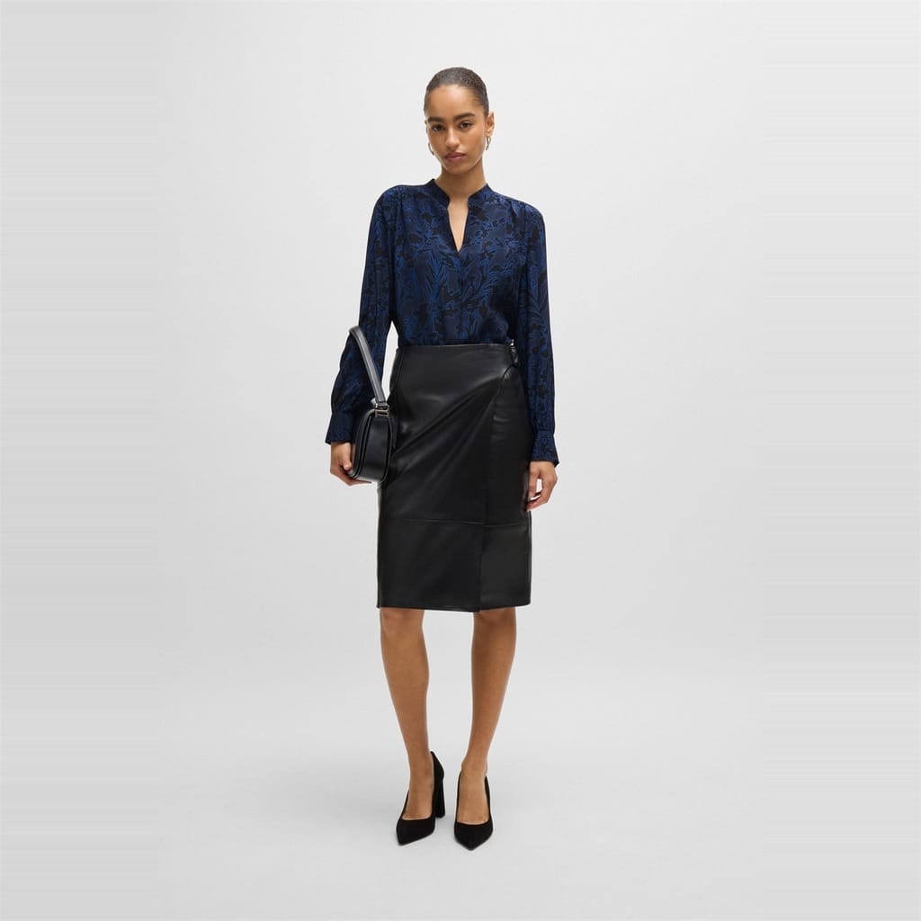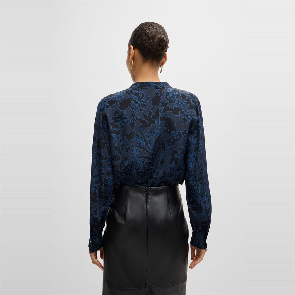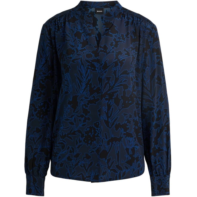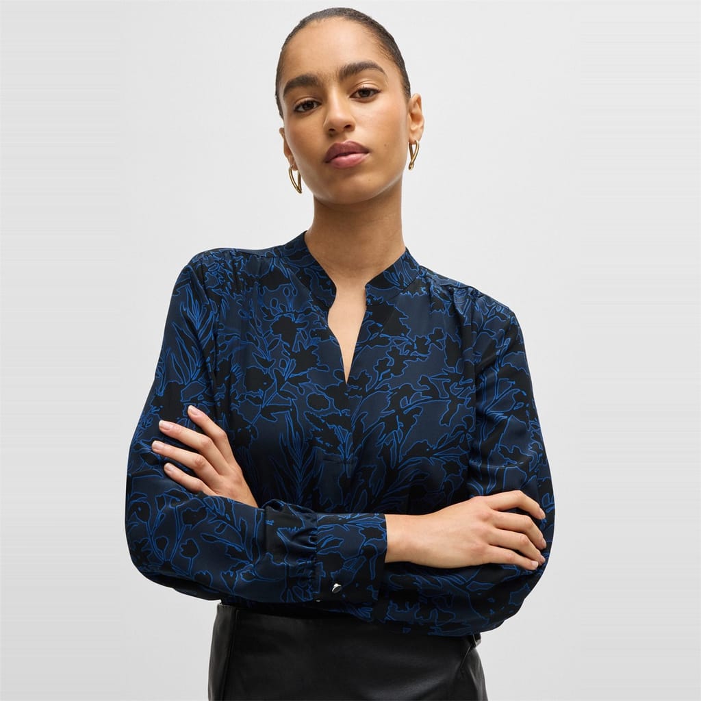 This Boss top features a notched neck and long sleeves, offering a regular fit. The floral pattern adds a touch of elegance, while the band collar provides a unique style element. Perfect for those seeking a blend of sophistication and comfort. -