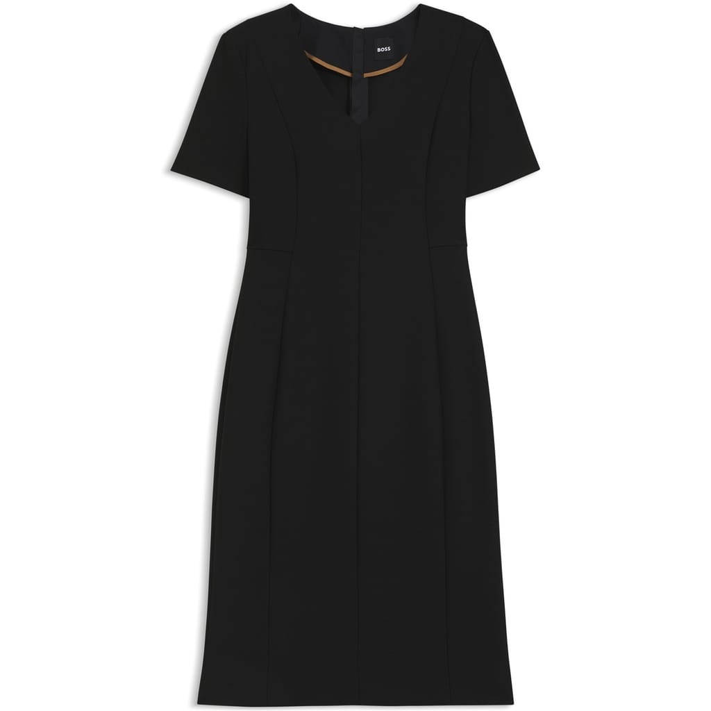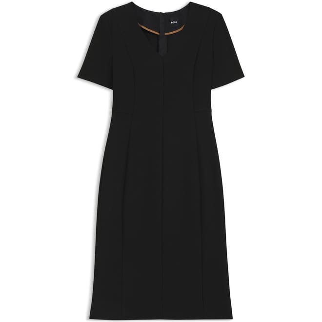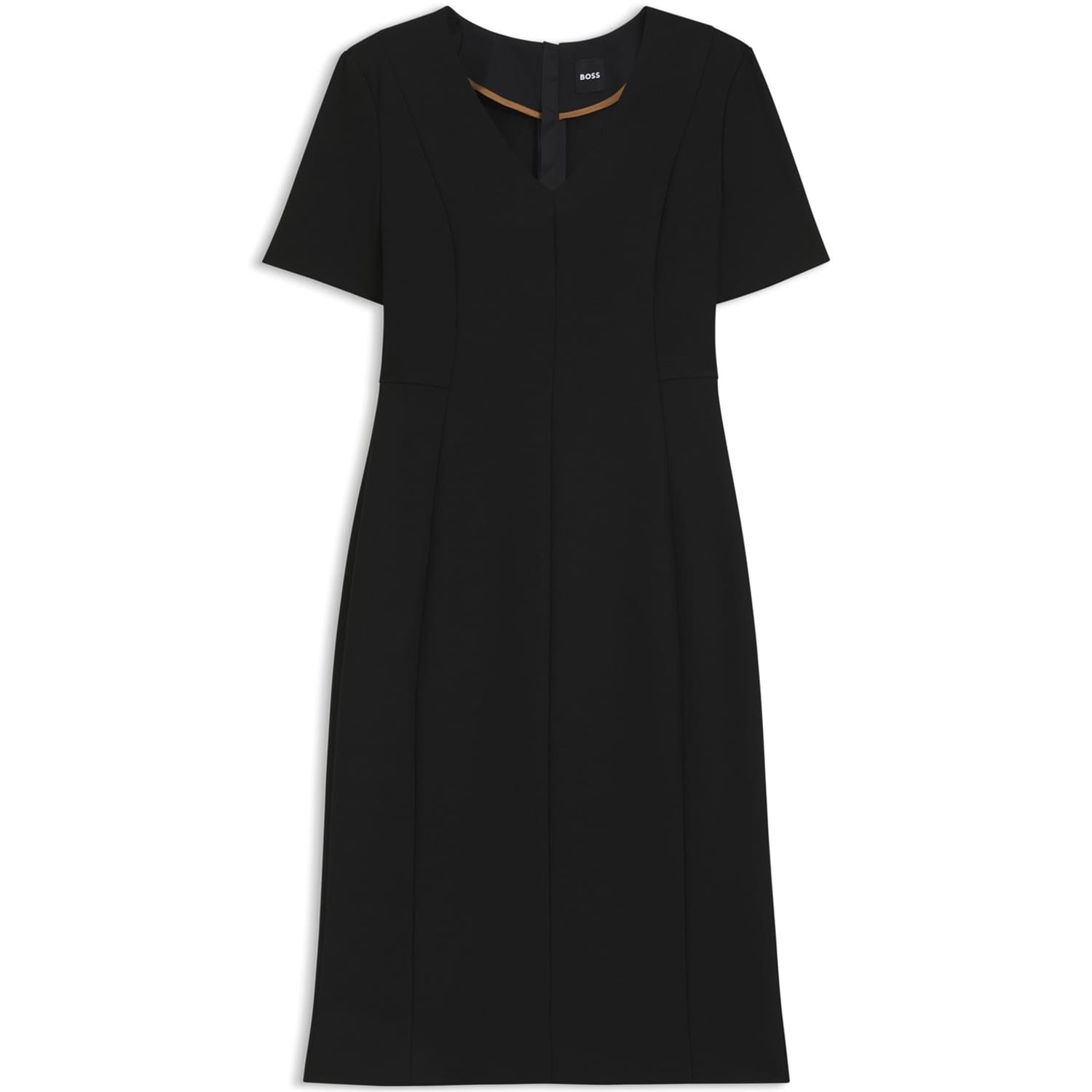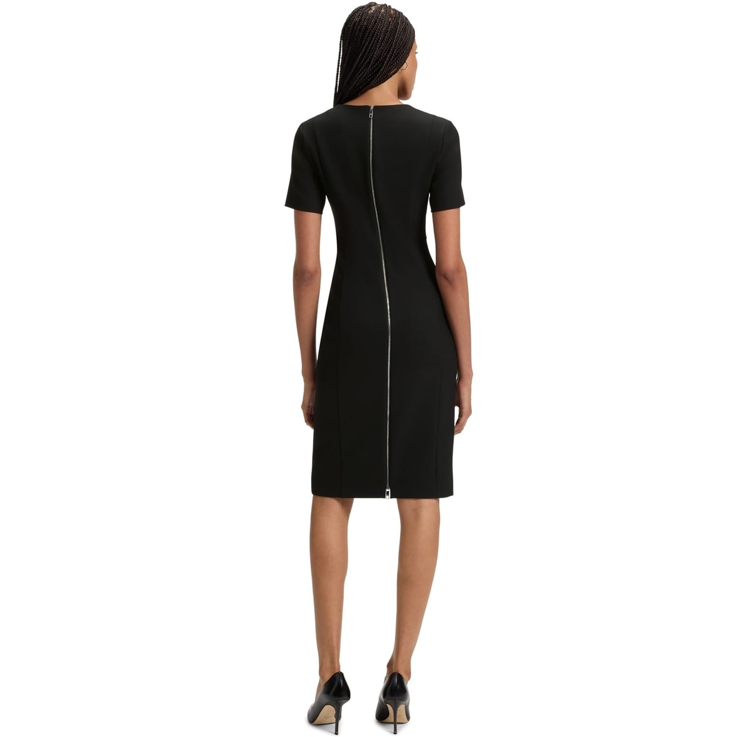 This Boss sheath dress is a sophisticated choice for any occasion. Crafted with a knee-length design, it features a flattering V-neck and a straight hem. The solid pattern adds a timeless appeal, while the back zipper closure and exposed zipper embellishment provide a modern touch. Designed in a regular fit, this dress offers both style and comfort. -