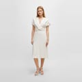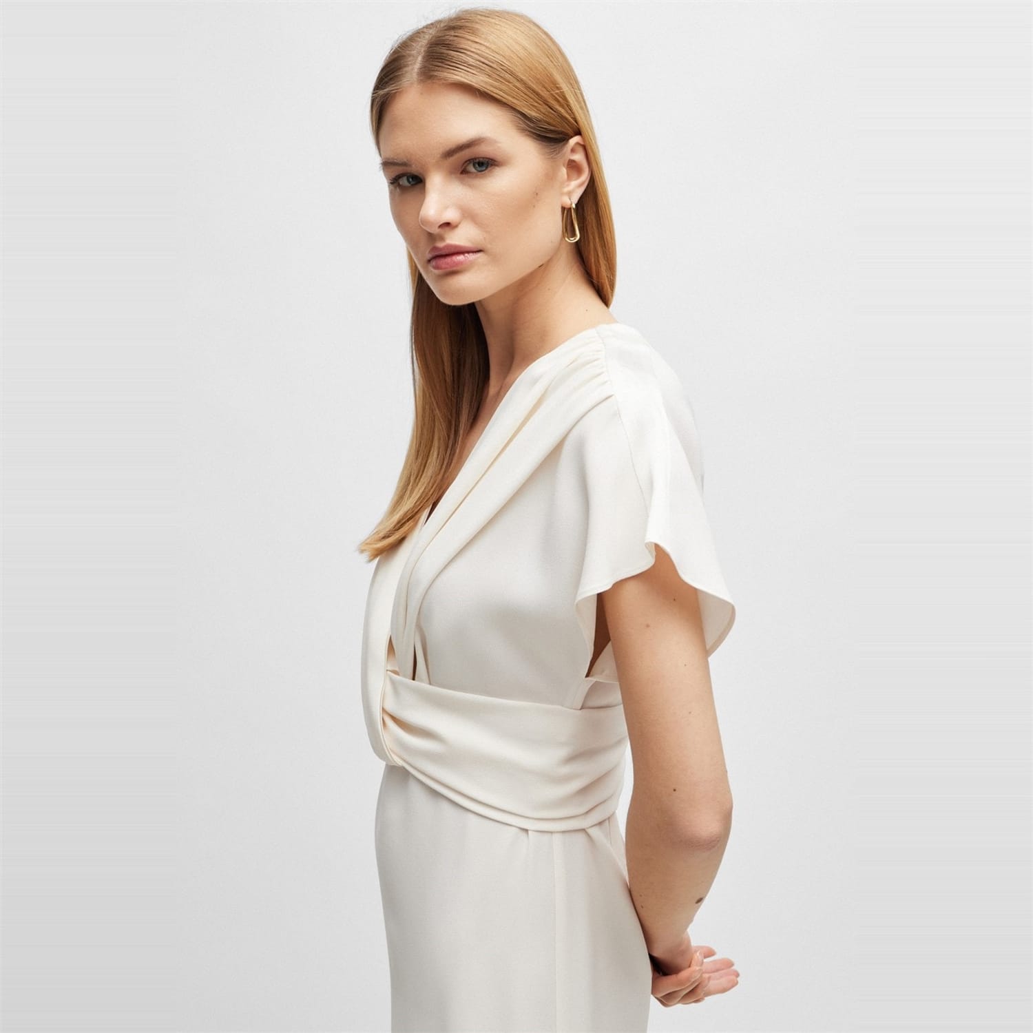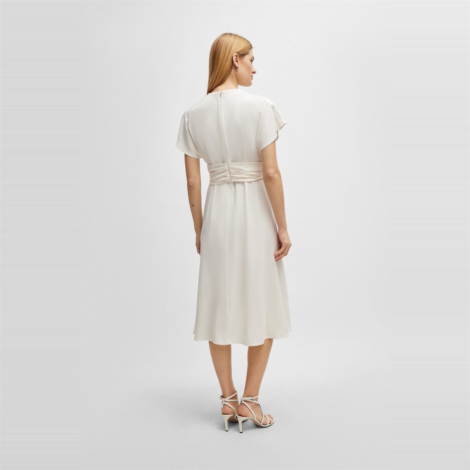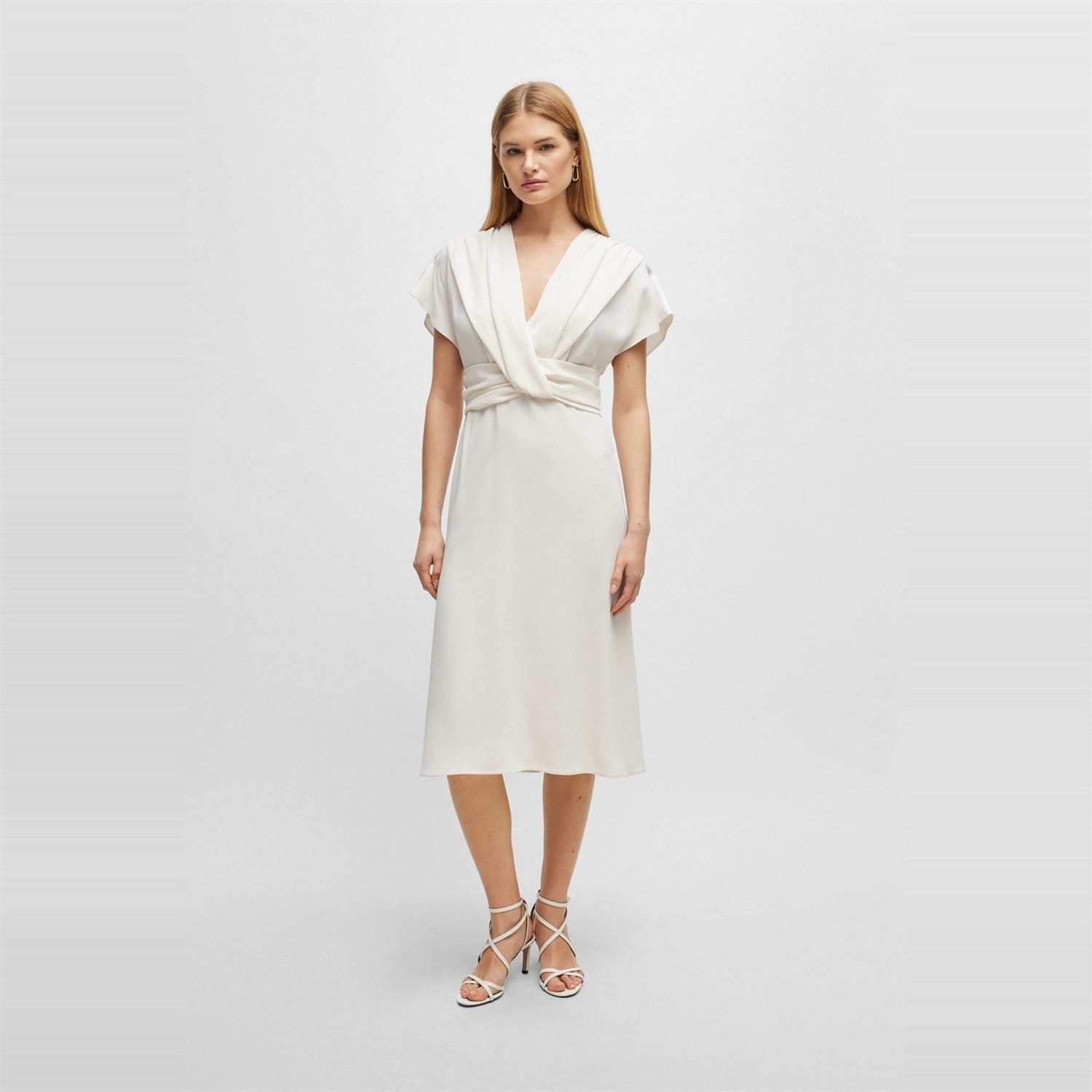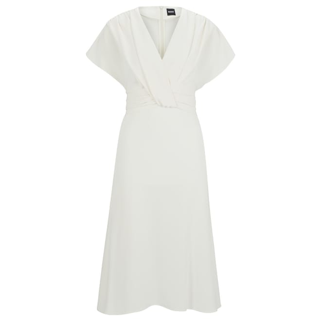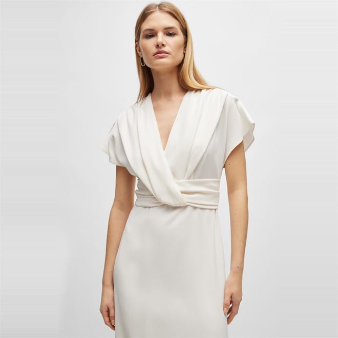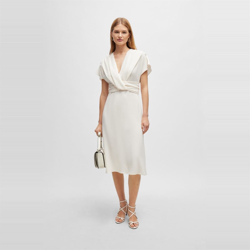 This Boss wrap dress is a sophisticated choice for any occasion. Featuring a midi length and a flattering V-neck, it offers a regular fit that complements the solid pattern. The short flutter sleeves add a touch of elegance, while the straight hemline ensures a polished finish. Ideal for those seeking a timeless and versatile piece. -