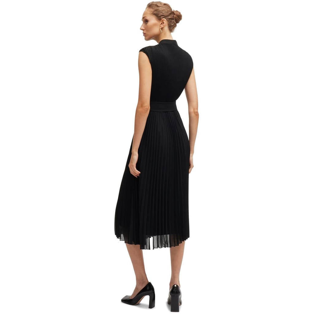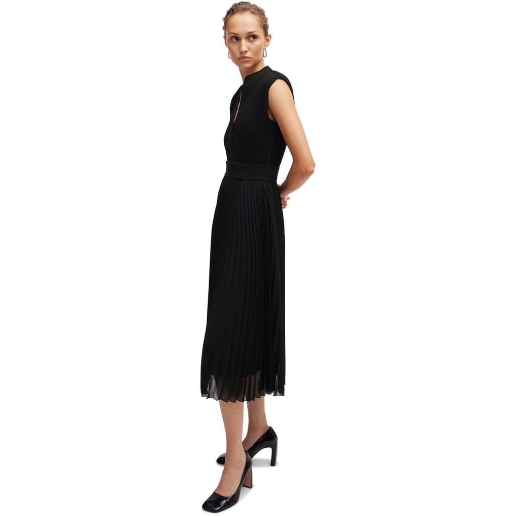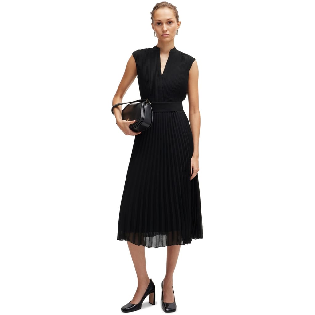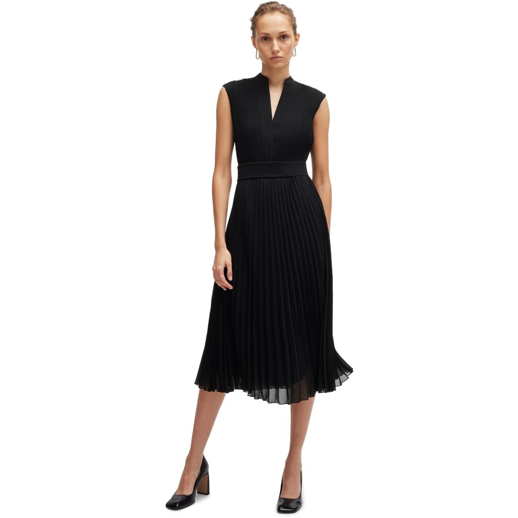 This Boss midi A-line dress features a notched neck and a band collar, offering a sophisticated look. The dress is adorned with vertical stripes and pleats, adding a touch of elegance. Its regular fit and straight hem ensure comfort and style, making it a versatile addition to any wardrobe. -