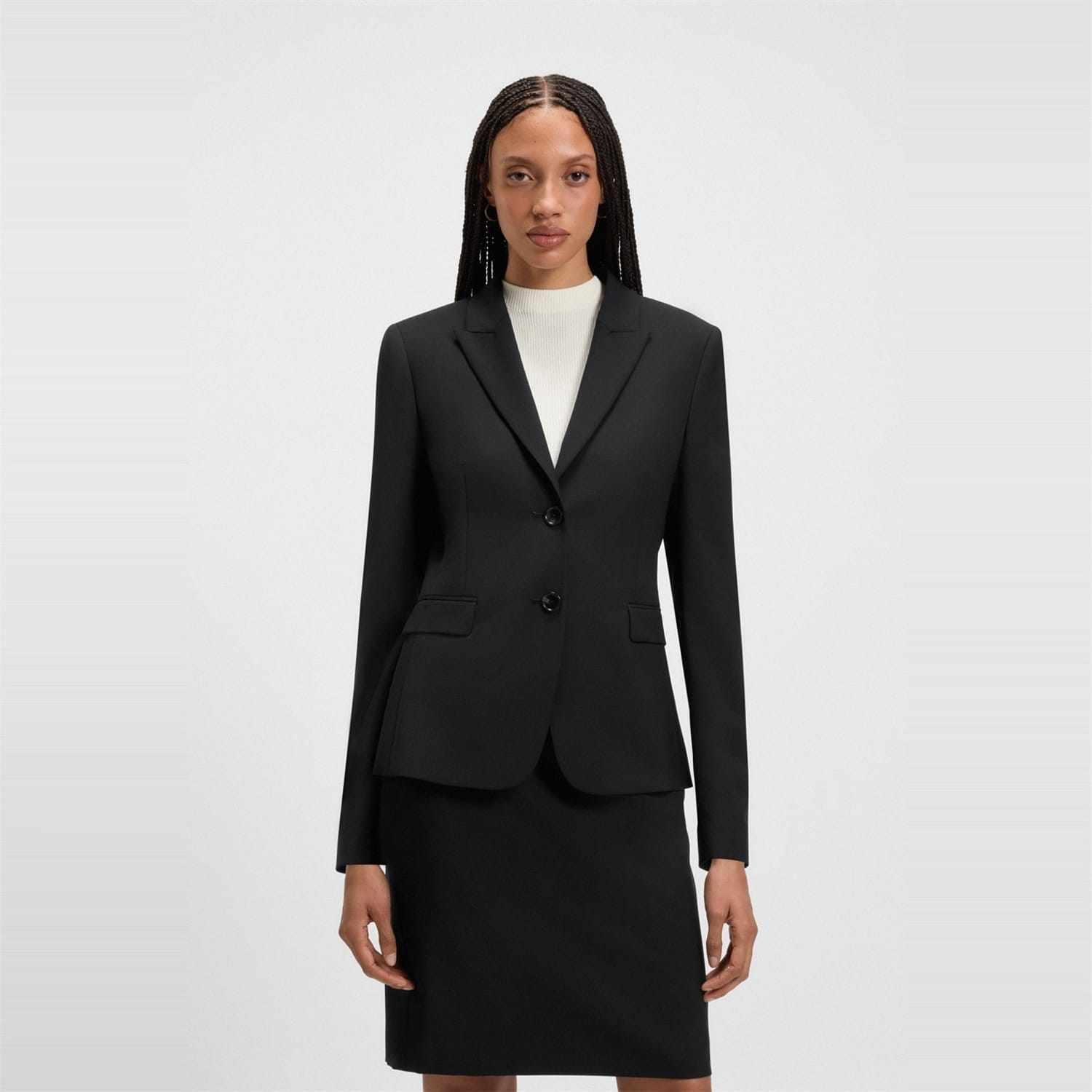 The Boss blazer from the workwear collection is a sophisticated choice for professional settings. This short, solid piece features a lapel collar and a straight hem, offering a regular fit. The button closure adds a classic touch, making it a versatile addition to any wardrobe. -