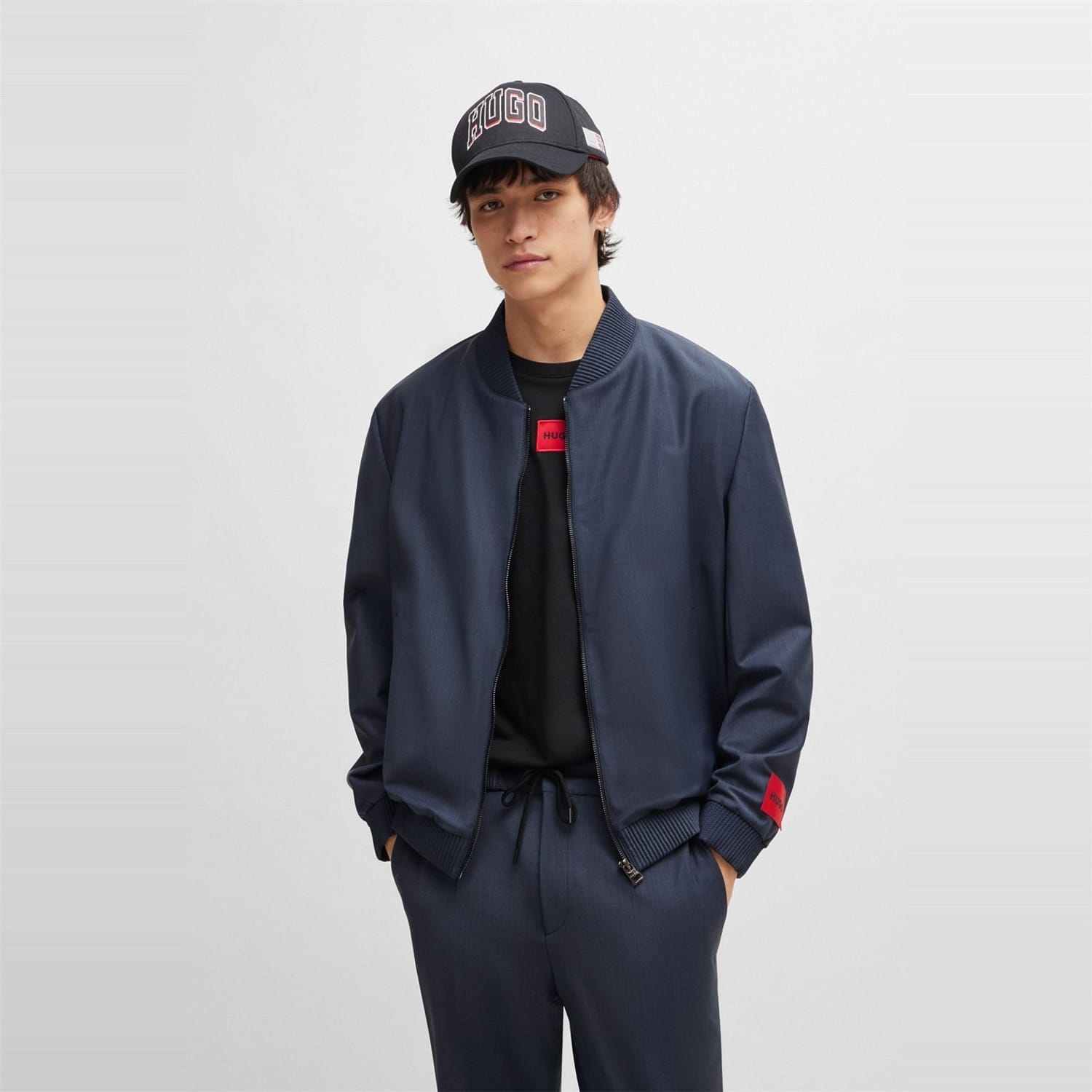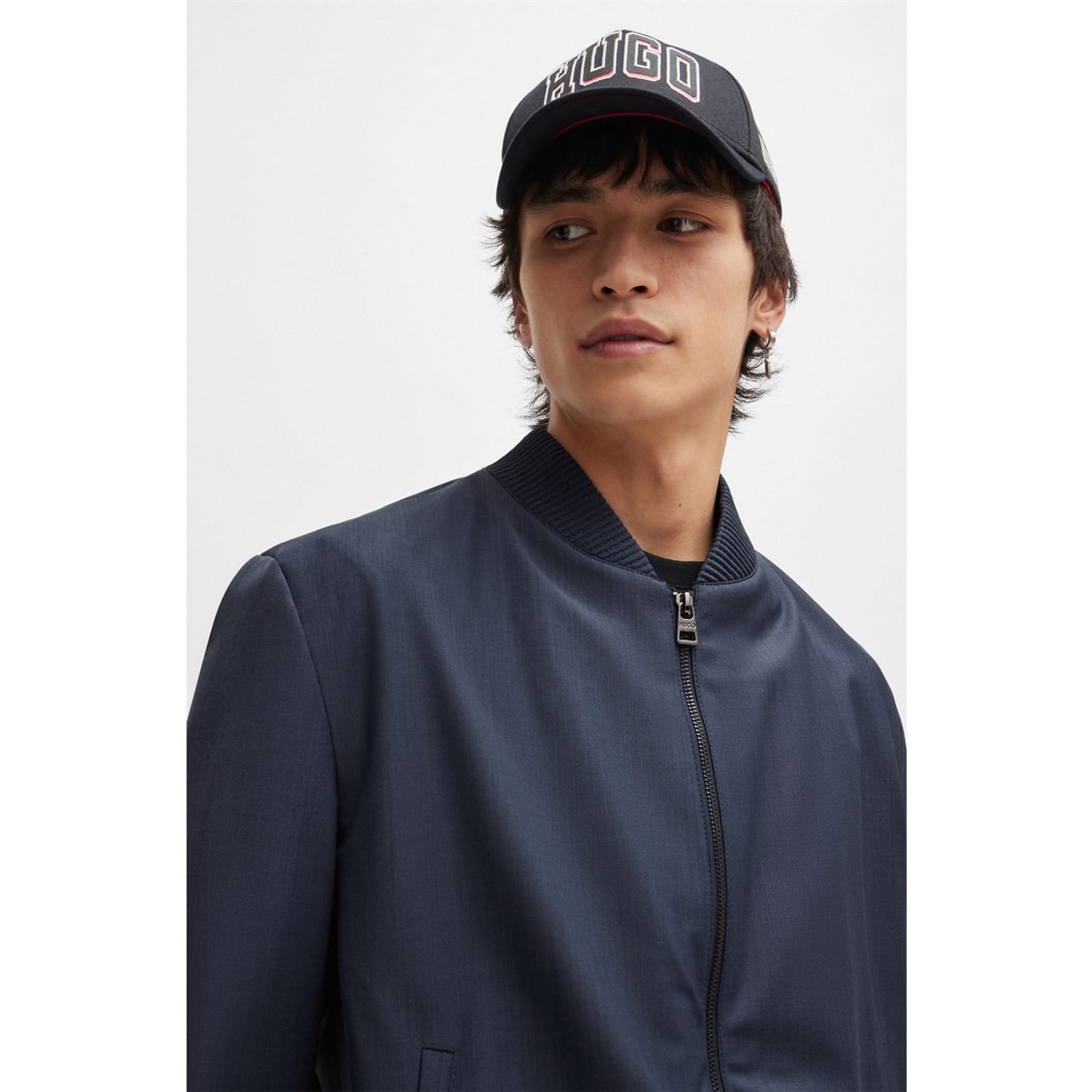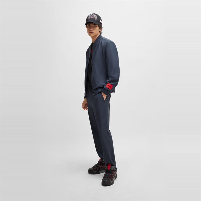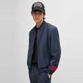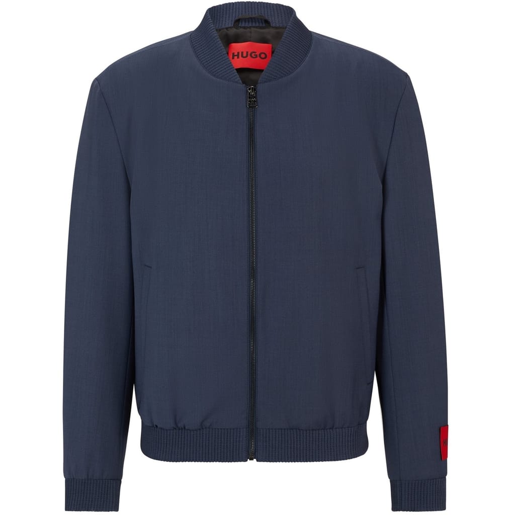 This Hugo bomber jacket features a solid pattern and a regular fit, offering a classic and versatile look. The jacket is designed with a ribbed crew neck, ribbed cuffs, and a ribbed hem, ensuring a snug fit. It includes a convenient zipper closure and is crafted in a short length, making it a stylish addition to any wardrobe. -