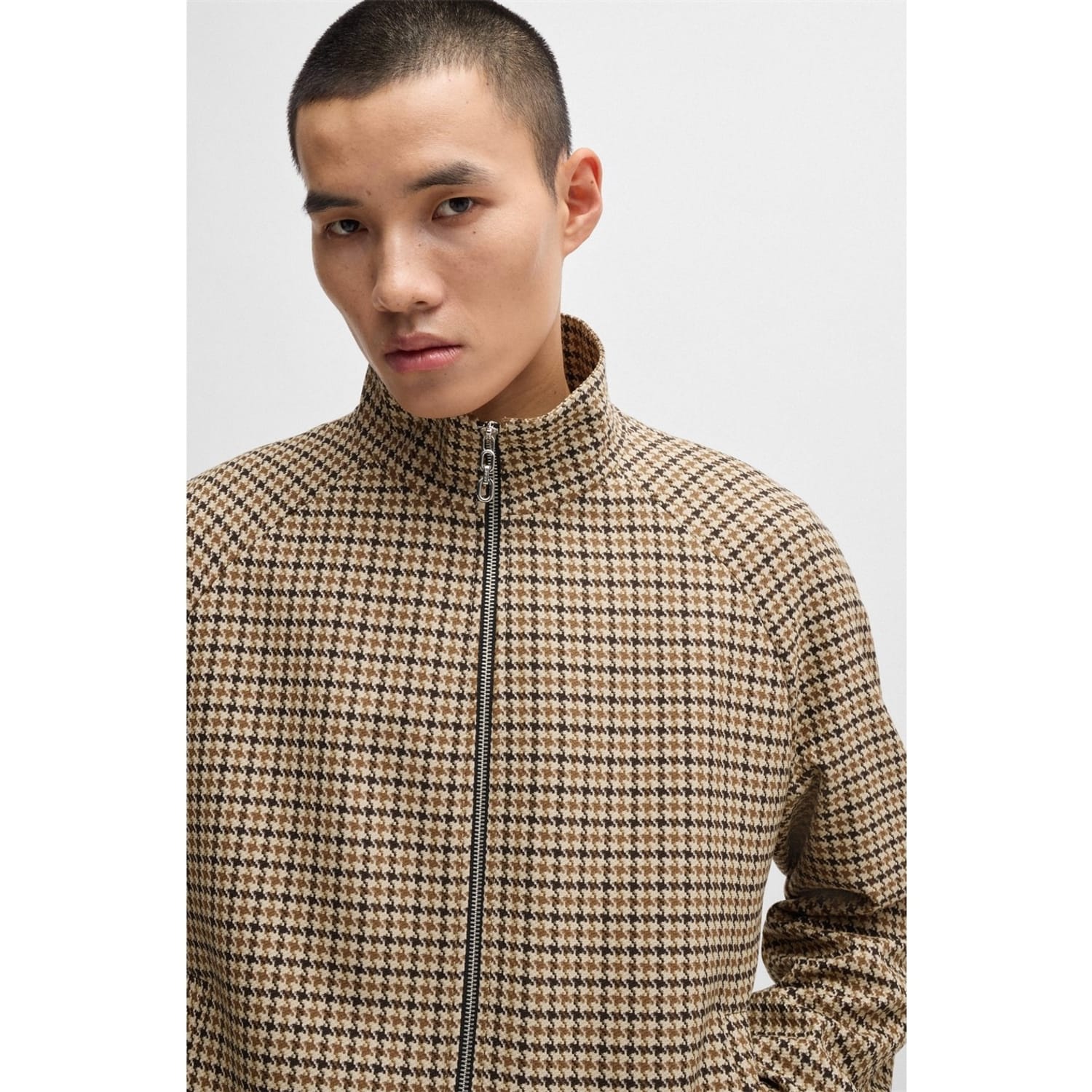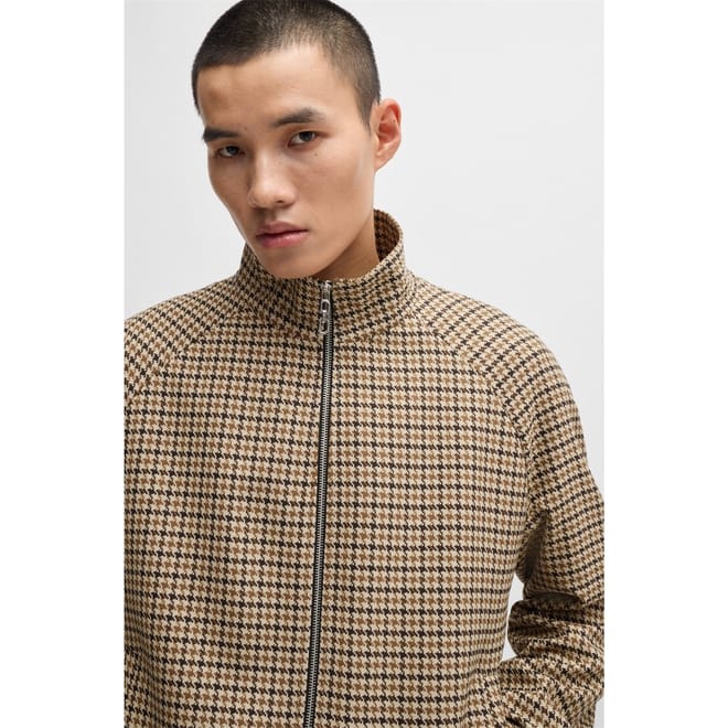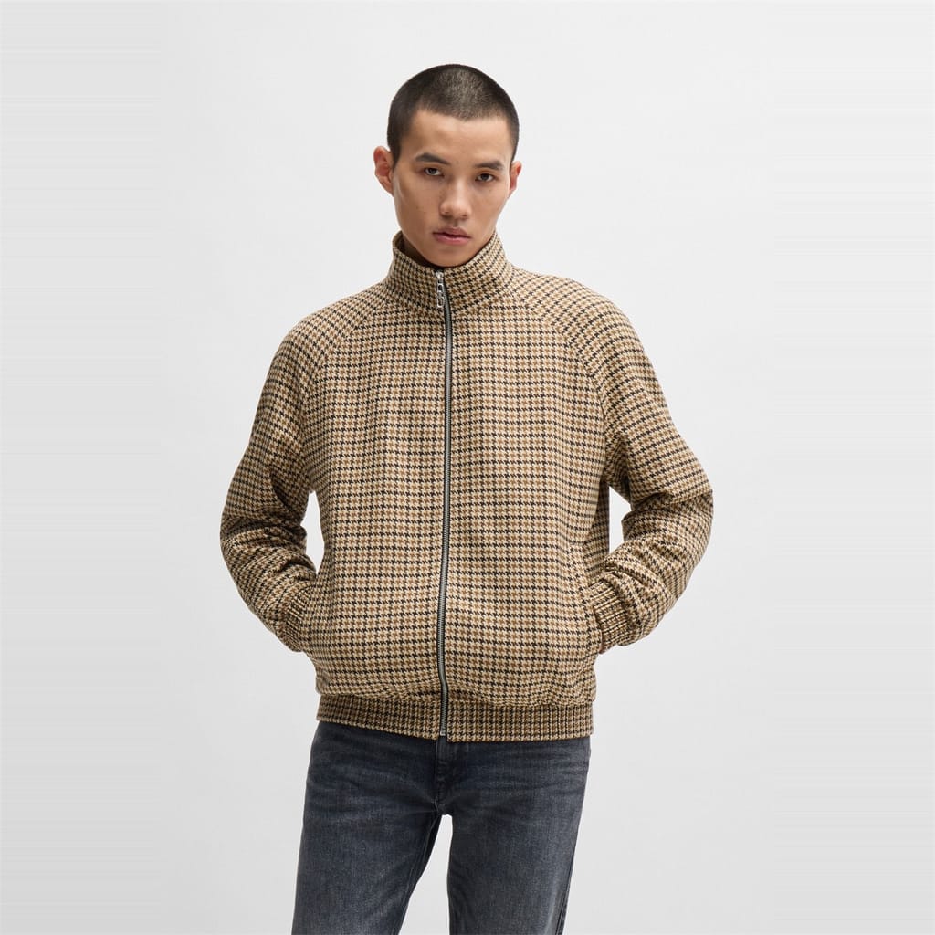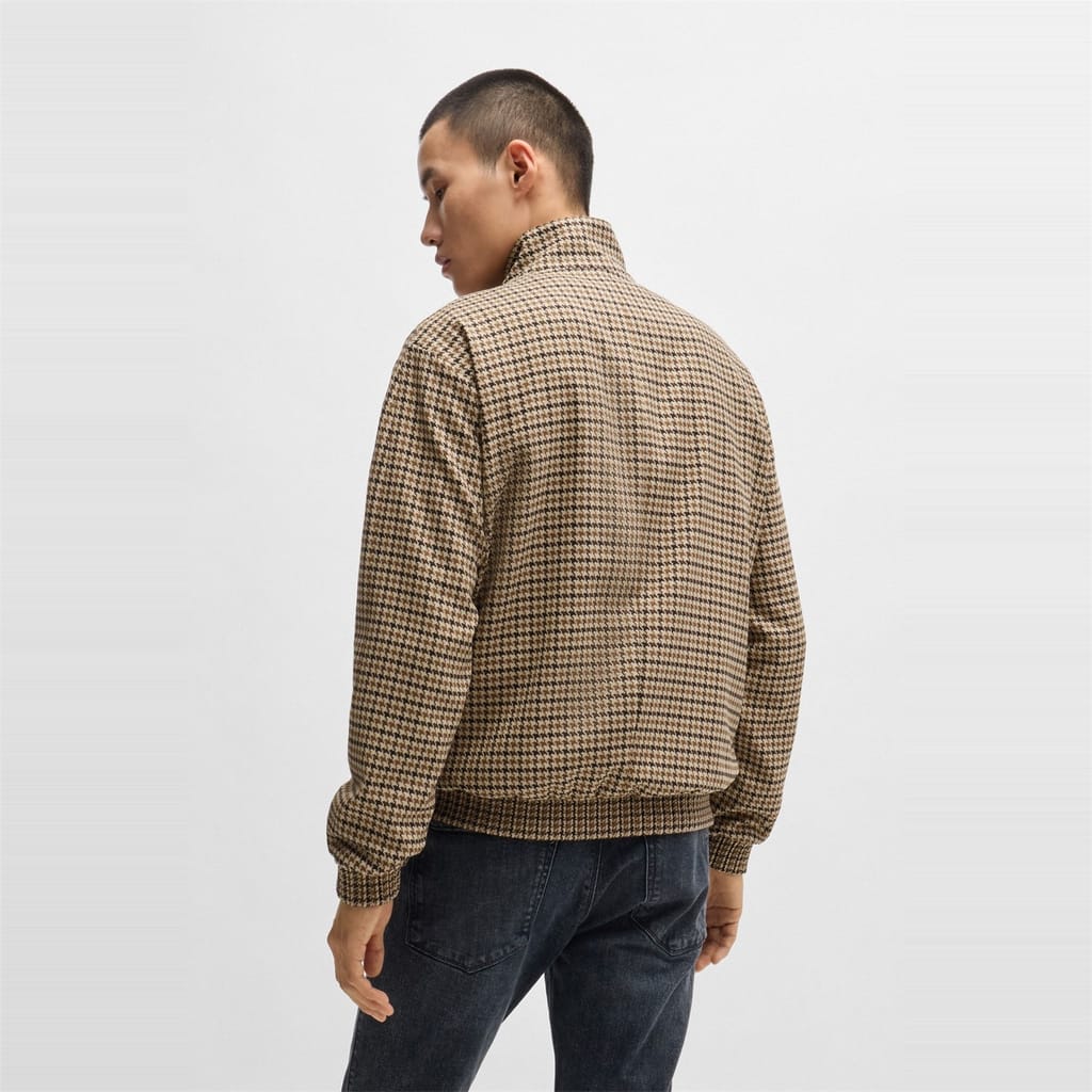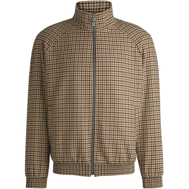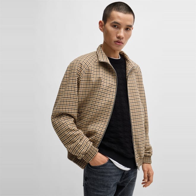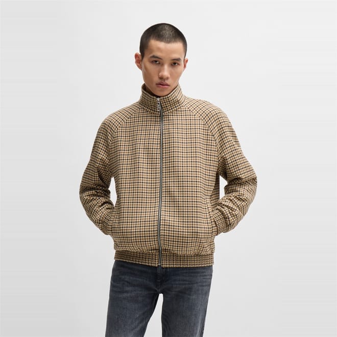 This Hugo jacket features a classic houndstooth pattern, offering a timeless appeal. Designed with a regular fit, it ensures comfort and style. The jacket is equipped with a convenient zipper closure and raglan sleeves, providing ease of movement. Its short length adds a modern touch, making it a versatile addition to any wardrobe. -