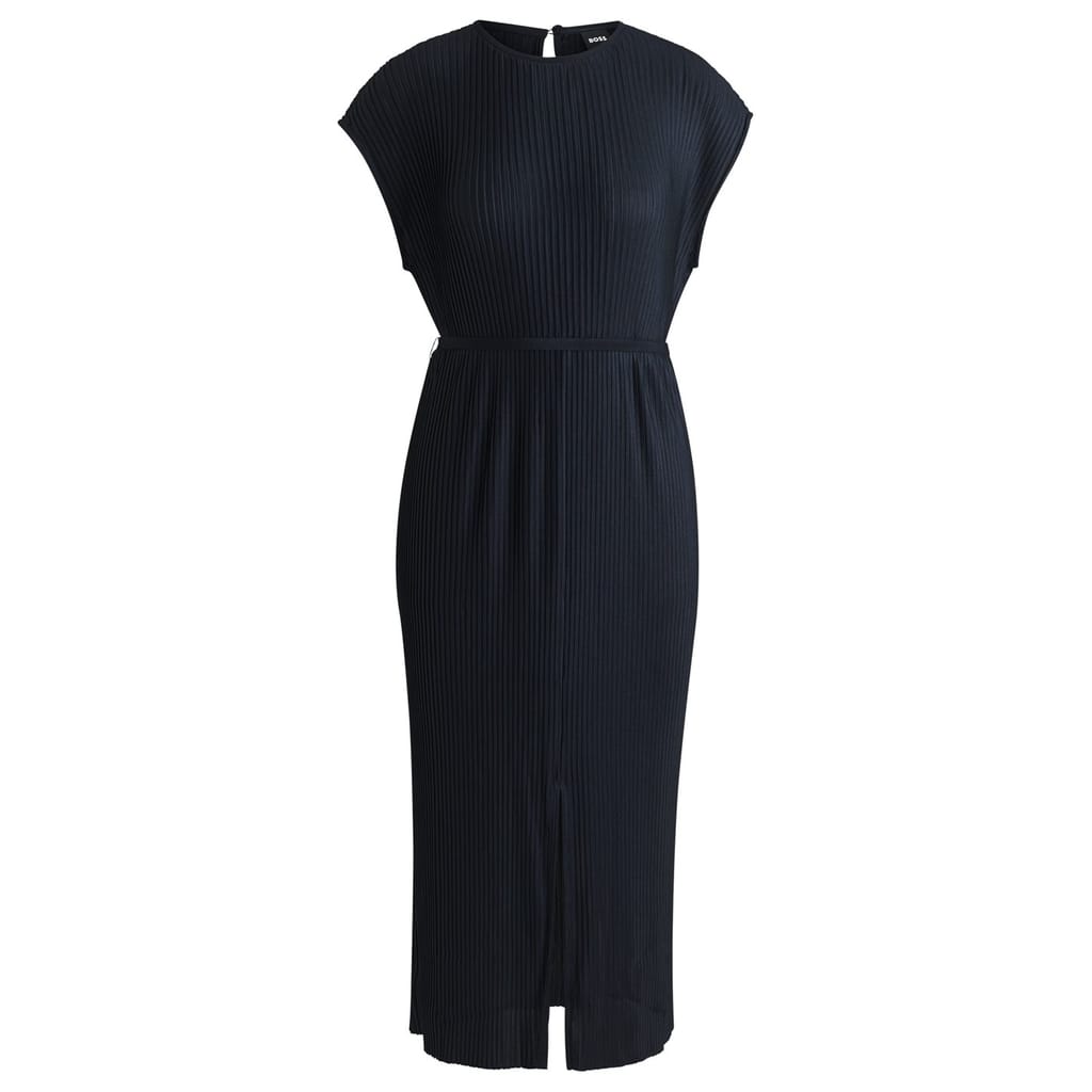 This Boss sheath dress is a sophisticated choice for any occasion. Crafted in a ribbed pattern, it features a midi length and a crew neck for a classic look. The short sleeves with cap sleeve style add a touch of elegance, while the straight hemline ensures a polished finish. Designed in a regular fit, this dress offers both comfort and style. -
