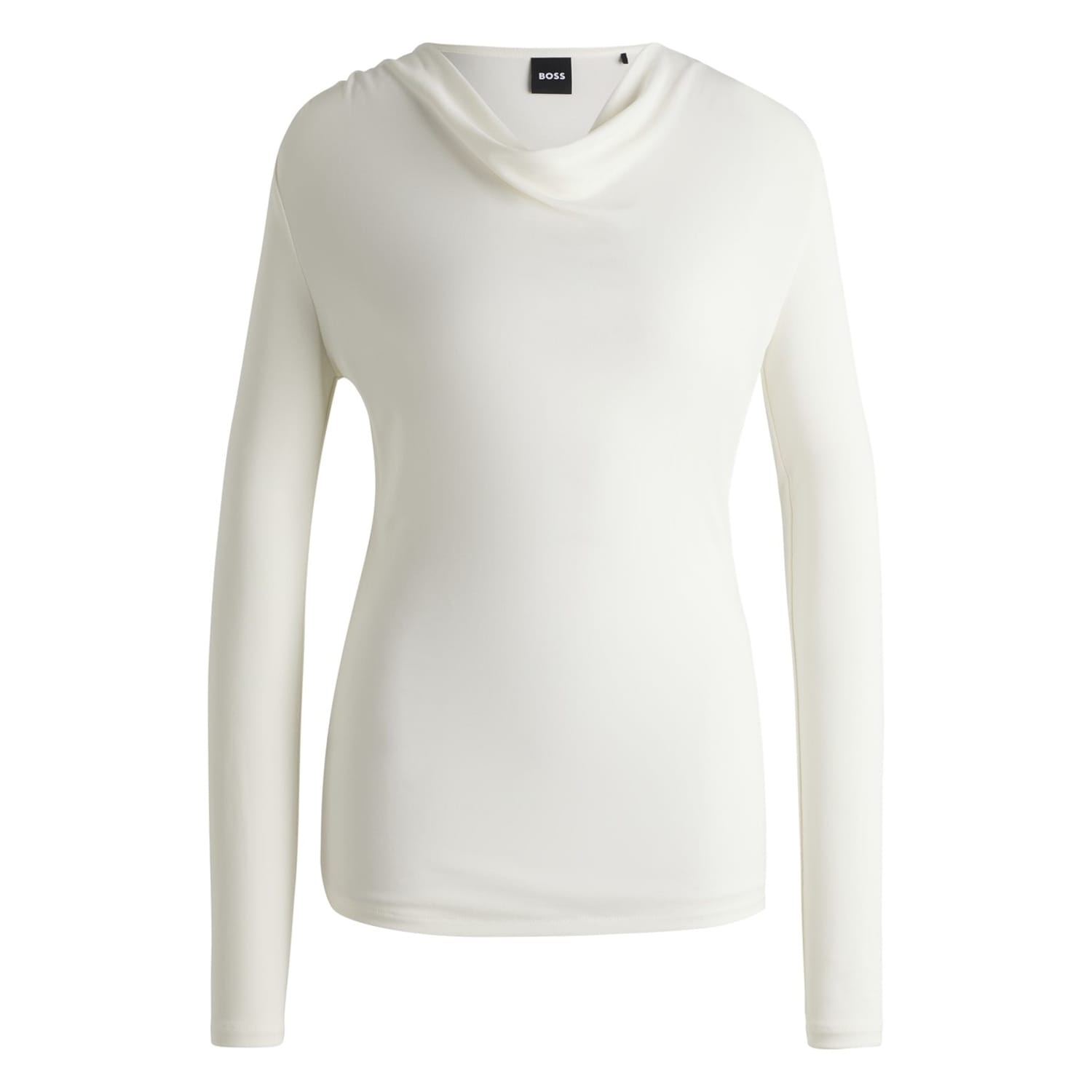 This Boss top features a cowl neck and a shawl collar, offering a sophisticated look. Designed with long sleeves and a slim fit, it provides a sleek silhouette. The solid pattern is complemented by a subtle logo embellishment, adding a touch of brand identity. The slip-on design ensures ease of wear, making it a practical choice for any wardrobe. -