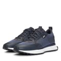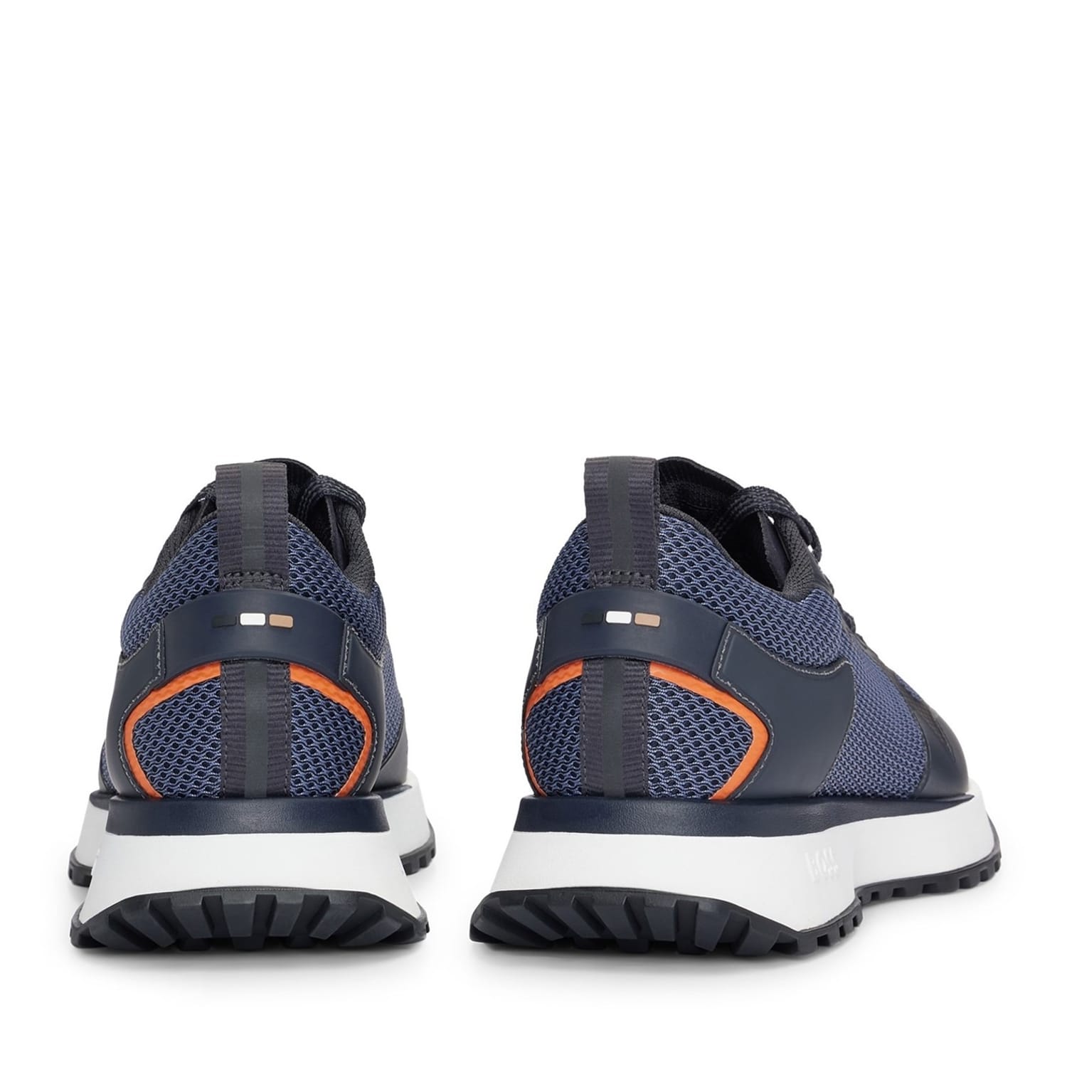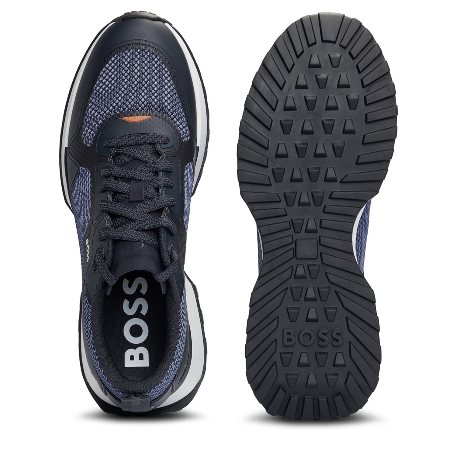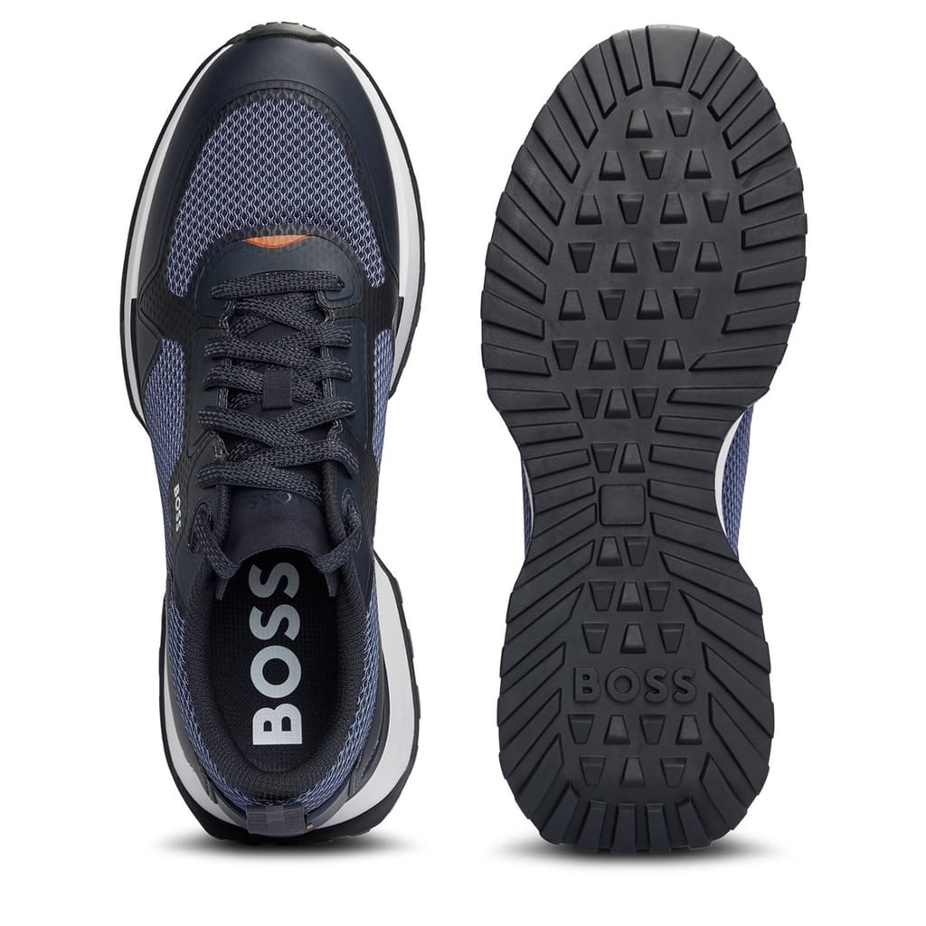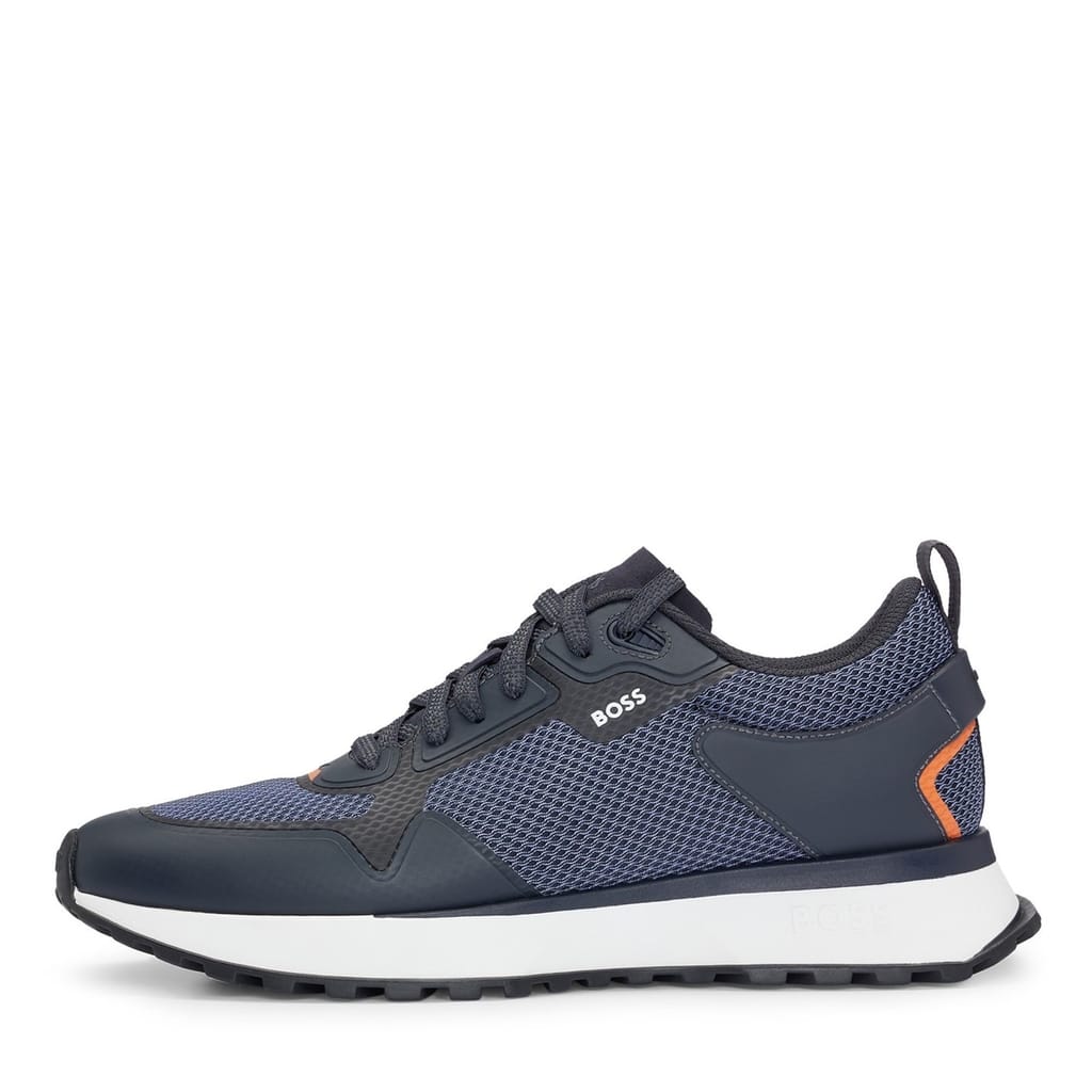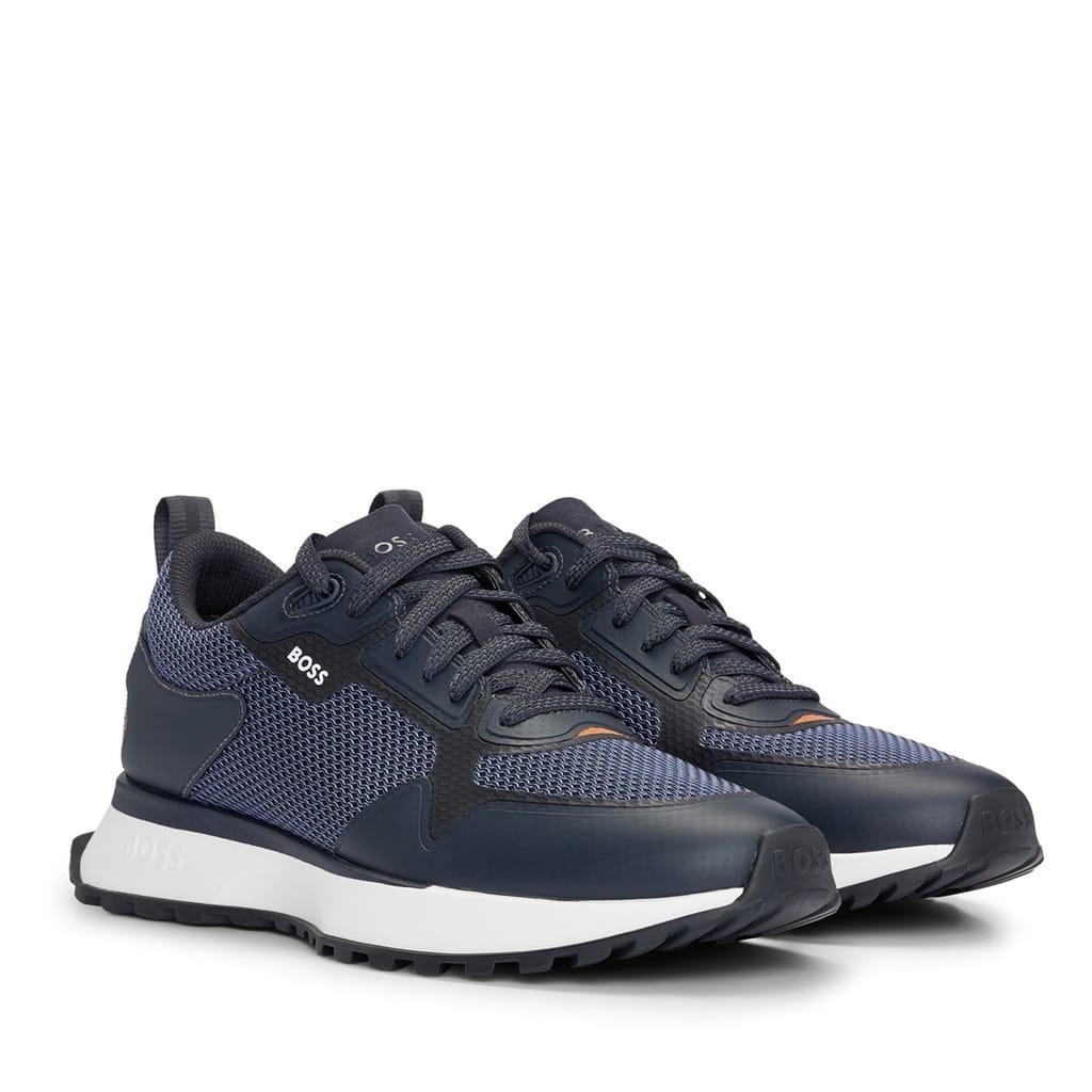 Combining contemporary styles with sporting aesthetics, the Boss Jonah Running Trainers are a cult staple in your casual collection. Crafted in a low profile silhouette made with a mesh and synthetic panelled upper, this pair are defined with a woven stripe adorned to the lateral sides for a subtle pop of colour while reflective overlays allow for visibility in low light. Set upon a chunky rubber sole with rigid accents for added stability, this pair offer a full lace fastening to the upper while the Boss branding adorned to the side and embossed to the heel adds a designer stamp.