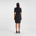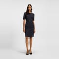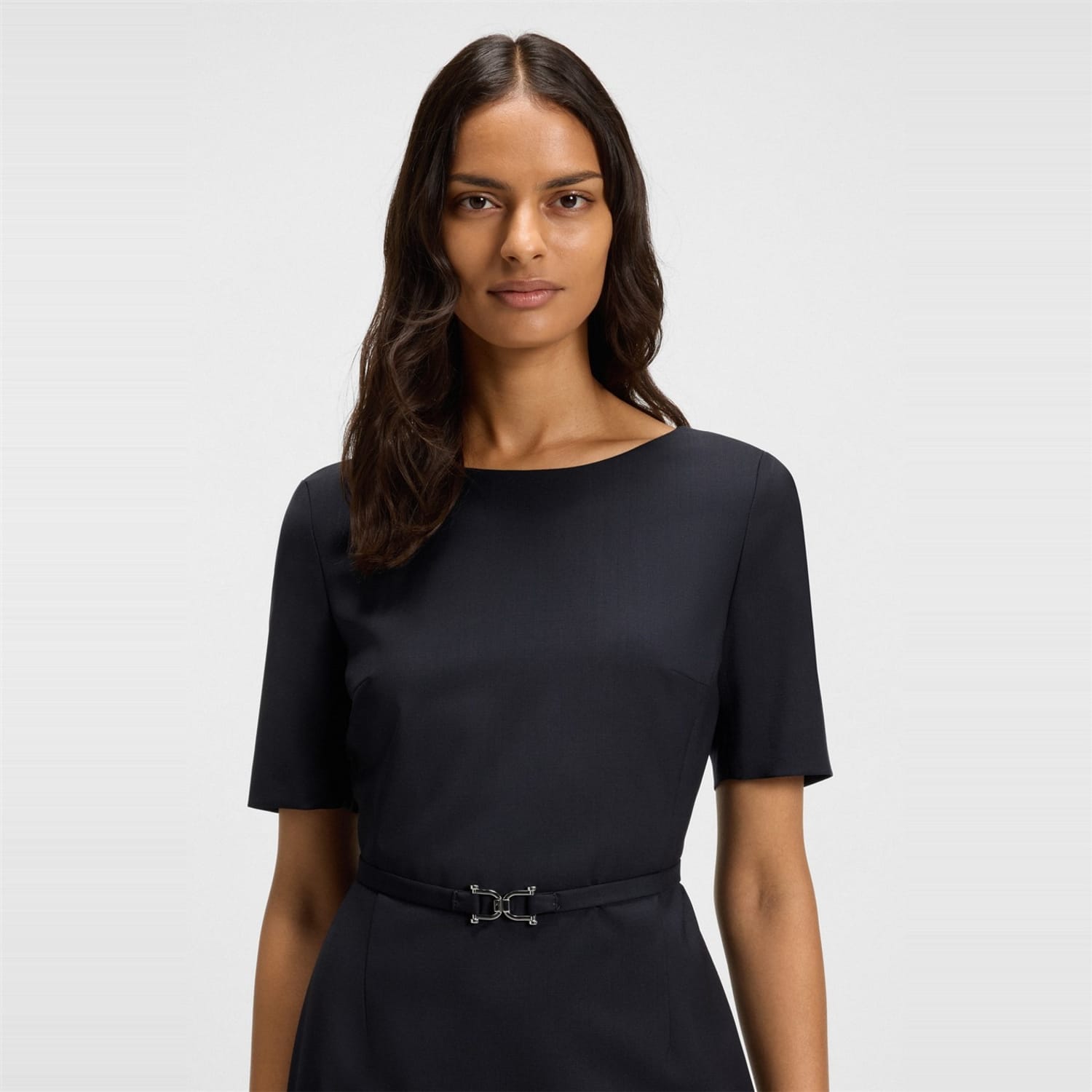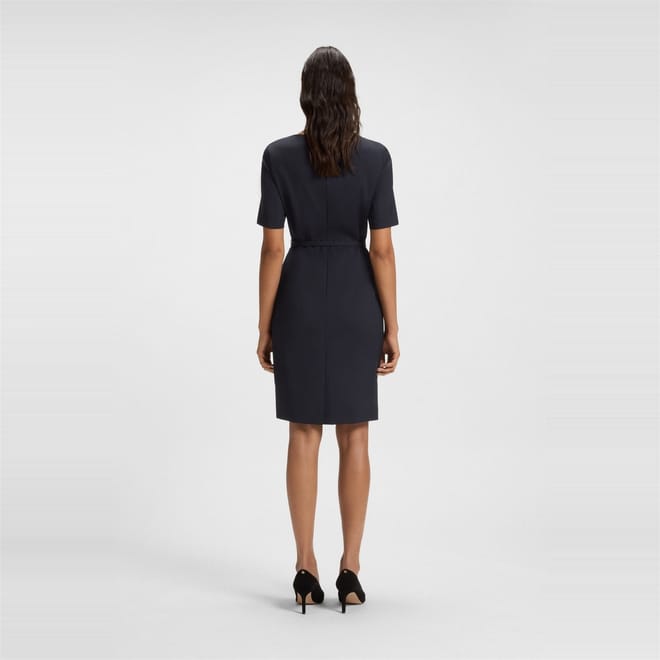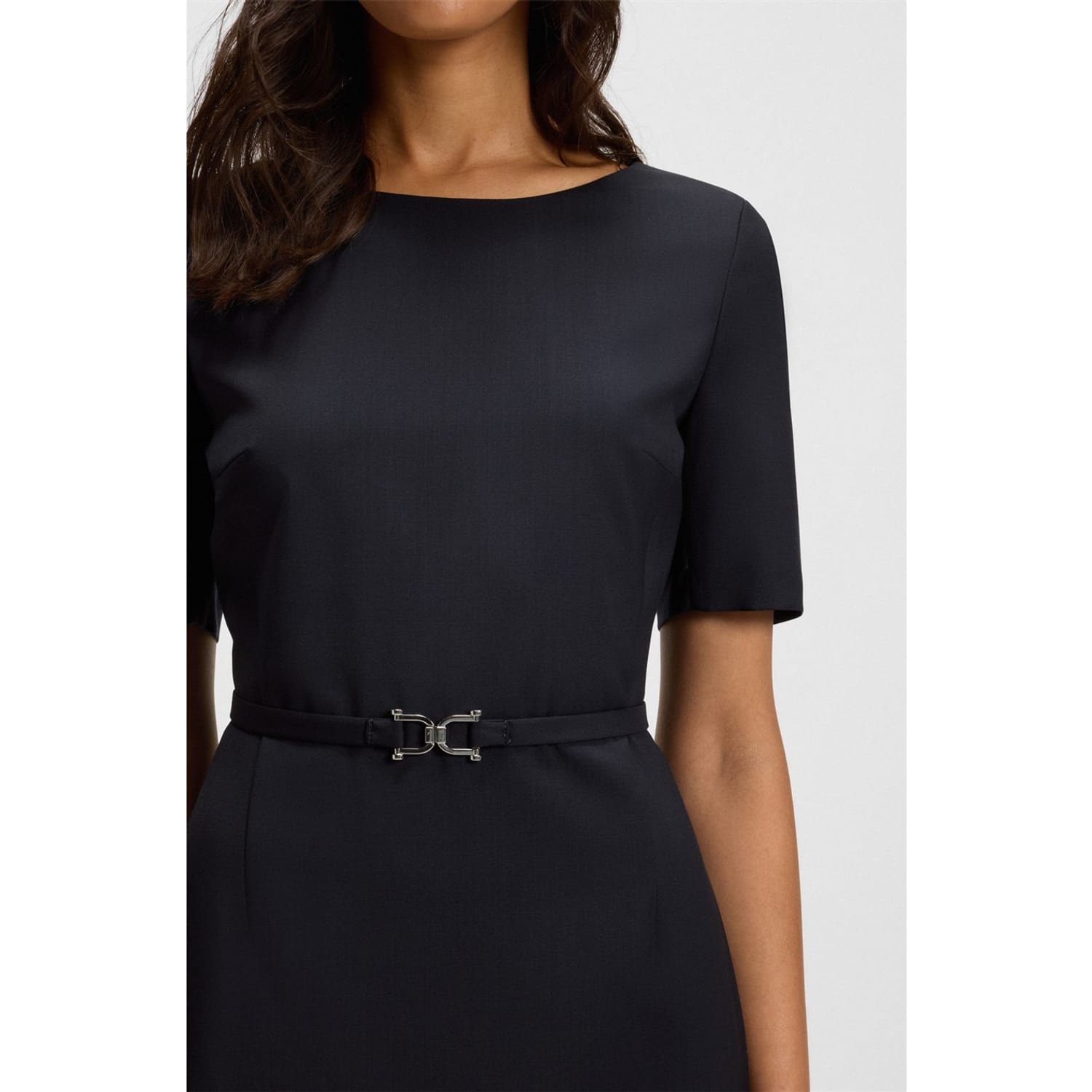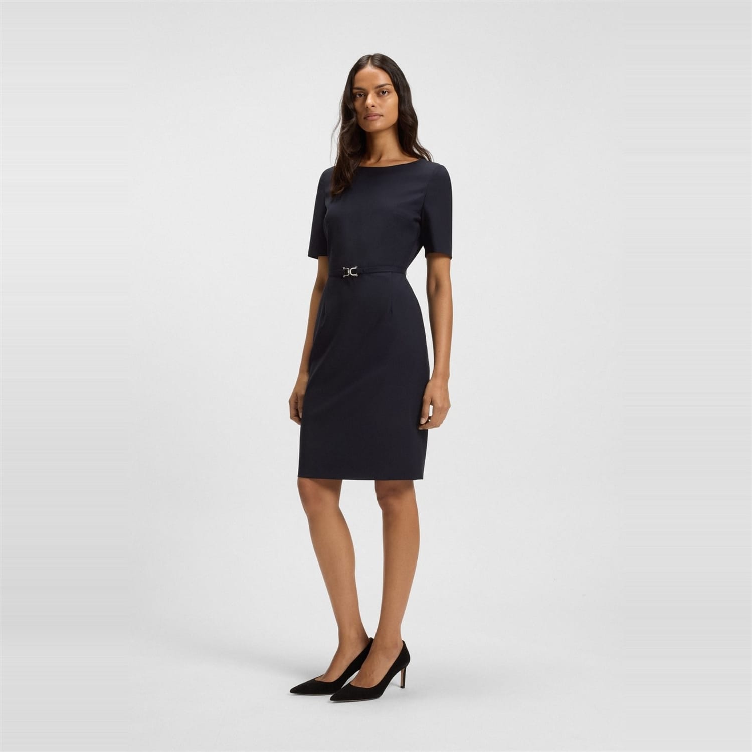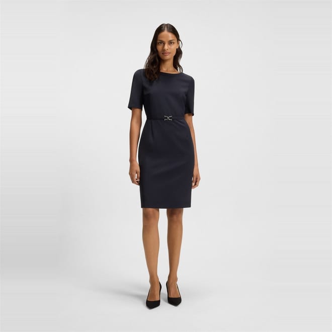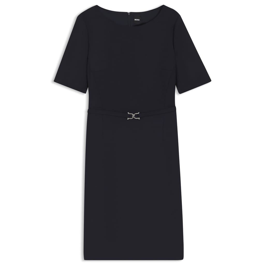 This Boss sheath dress features a knee-length design with a boat neck and a back zipper closure. The solid pattern and regular fit create a sleek silhouette, while the straight hem adds a touch of elegance. A subtle metal logo embellishment completes the look, making it a refined choice for any occasion. -