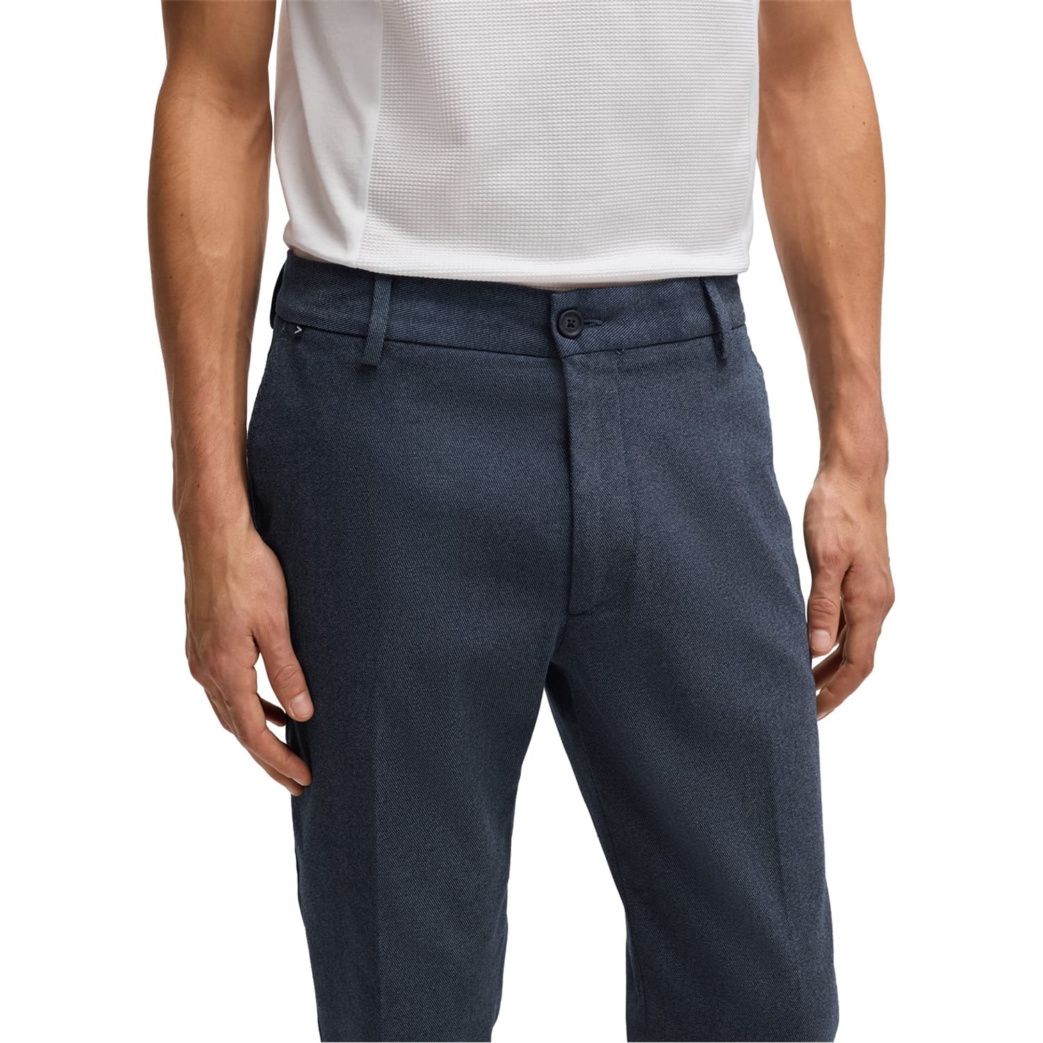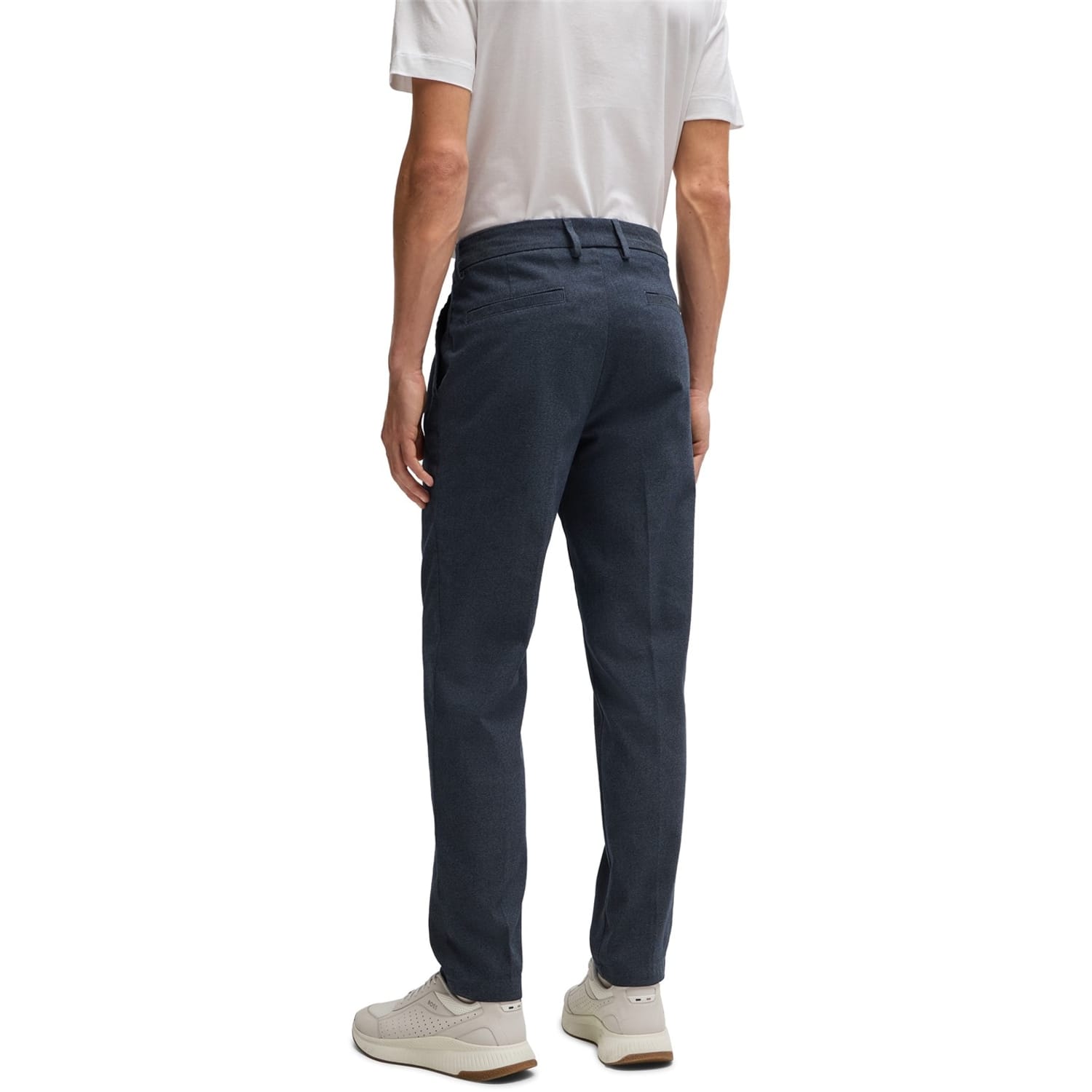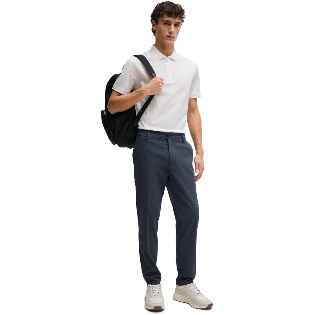 These Boss chinos offer a refined take on casual trousers. Featuring a zip fly and front button closure, they are designed with belt loops for added versatility. The trousers include welt pockets, flat front pockets, and back pockets, providing ample storage. Crafted with attention to detail, these chinos are a stylish addition to any wardrobe. -