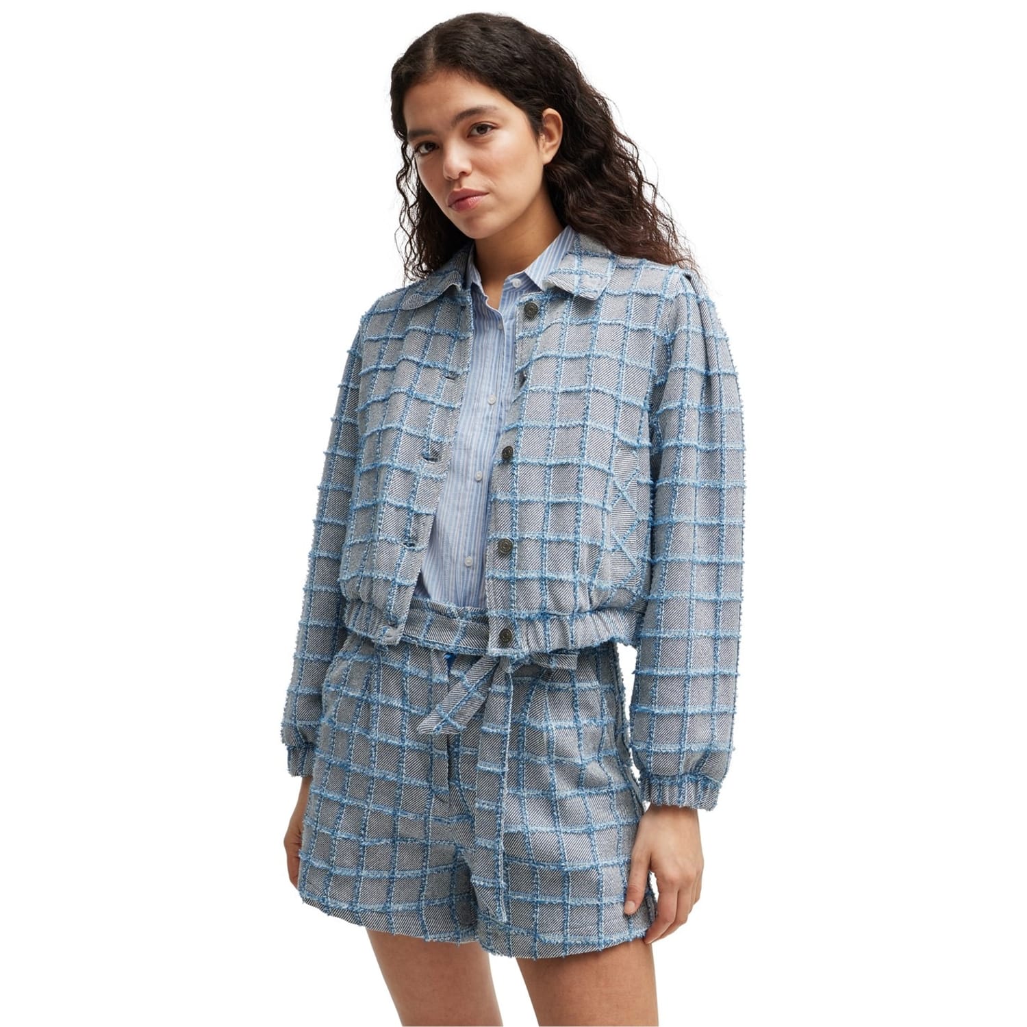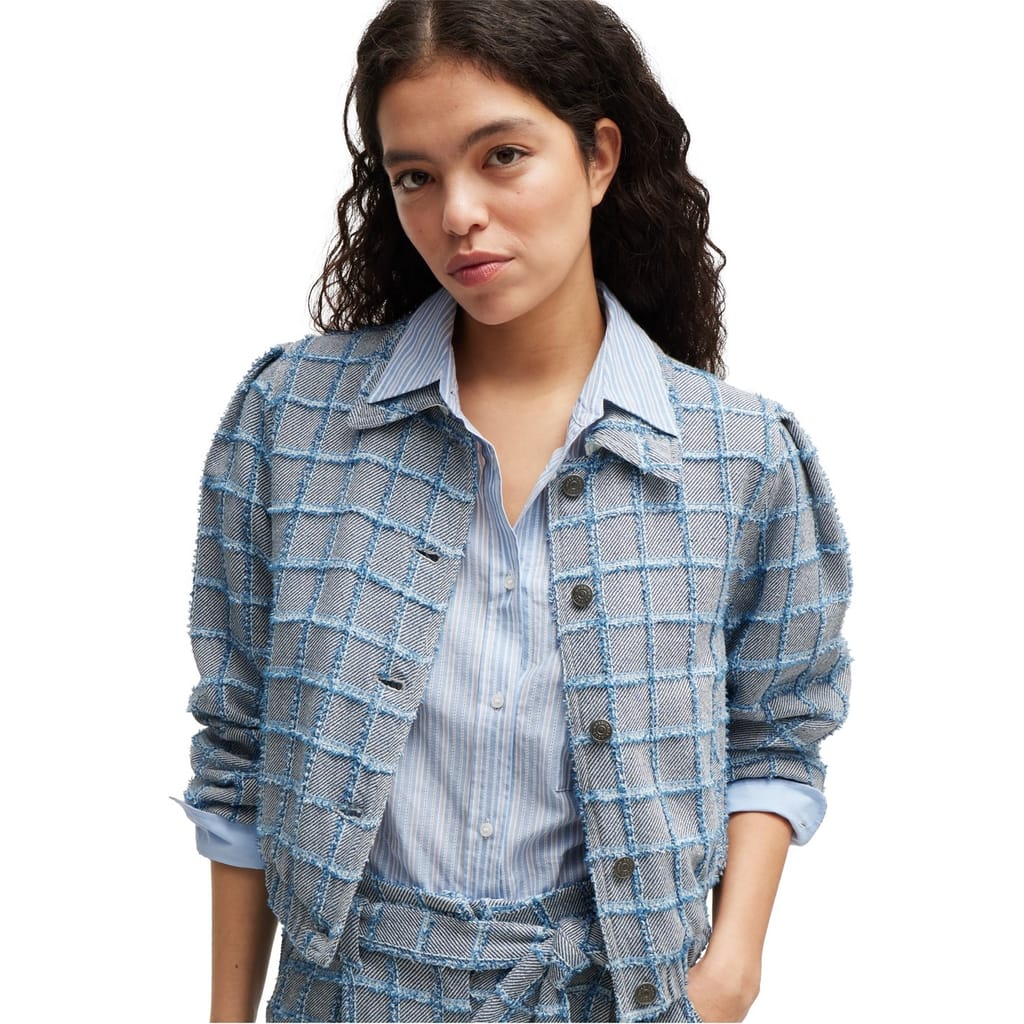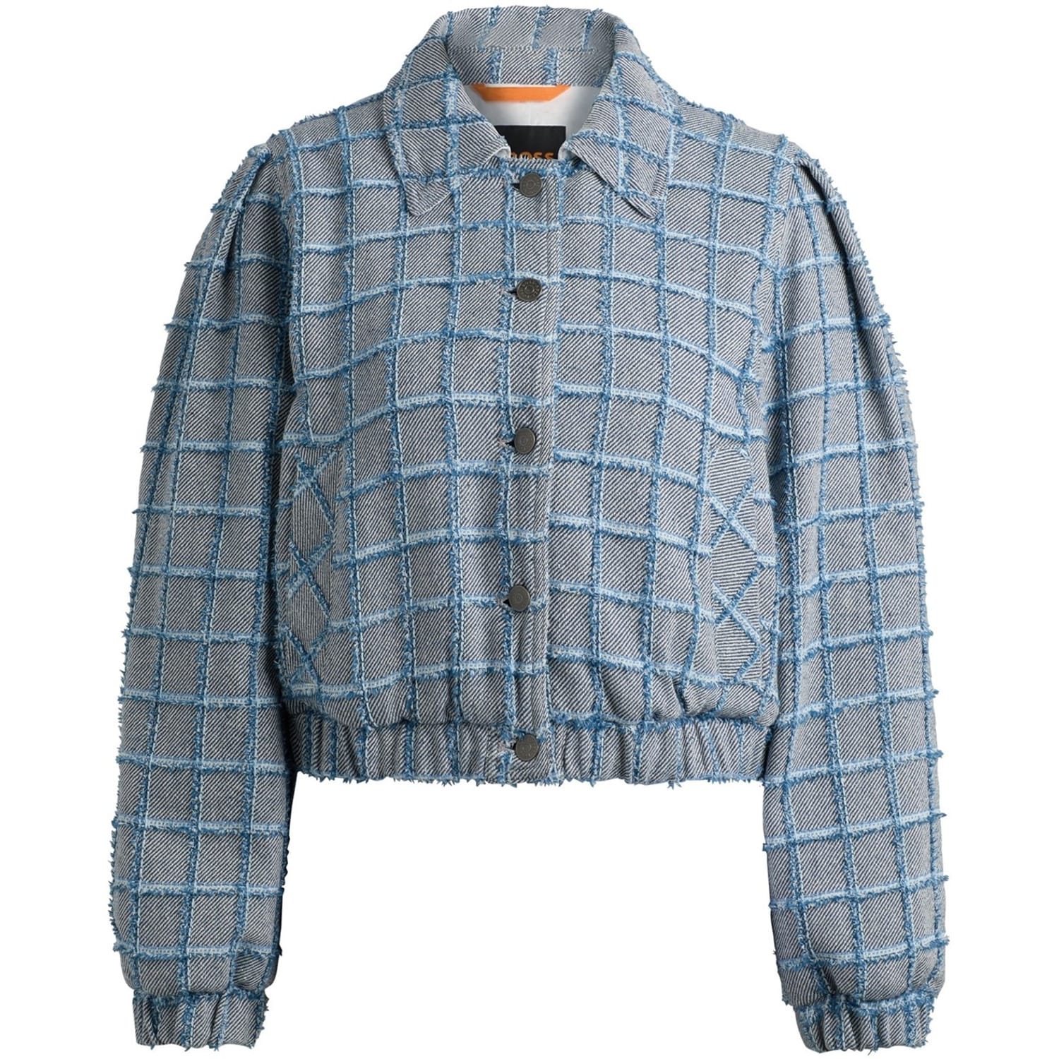 This Boss shirt jacket features a classic plaid pattern, offering a stylish yet versatile look. Designed with a shirt collar and button closure, it ensures a comfortable fit. The regular fit and short length make it ideal for layering. An elasticated hem adds a touch of modernity to this timeless piece. -