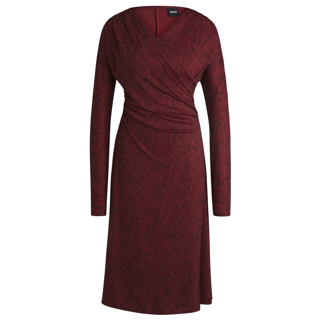 This Boss wrap dress features a striking snake pattern, offering a unique twist on a classic design. The midi length and V-neckline create an elegant silhouette, while the long sleeves provide a sophisticated touch. With a regular fit and straight hem, this dress is perfect for those seeking a stylish yet comfortable option for various occasions. -