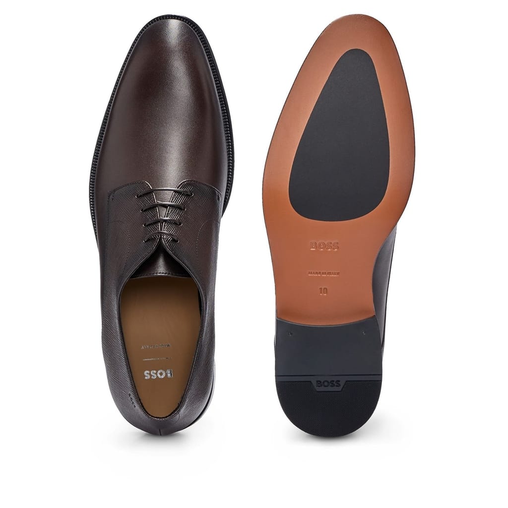 Elevate your formal attire with these Boss smart shoes. Crafted in a classic oxford style, they feature a sophisticated almond toe design. The textured pattern adds a touch of elegance, making them a perfect choice for any formal occasion. These shoes seamlessly blend style and comfort, ensuring you make a lasting impression. -