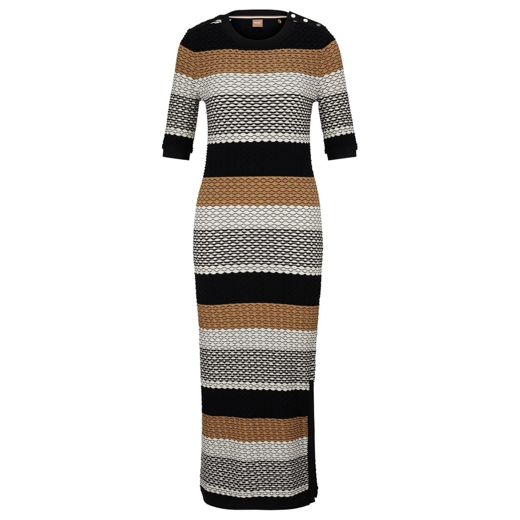 This Boss sheath dress is a maxi-length piece featuring a crew neck and a regular fit. The dress showcases a horizontal stripe pattern and a straight hem, offering a sophisticated look for various occasions. -