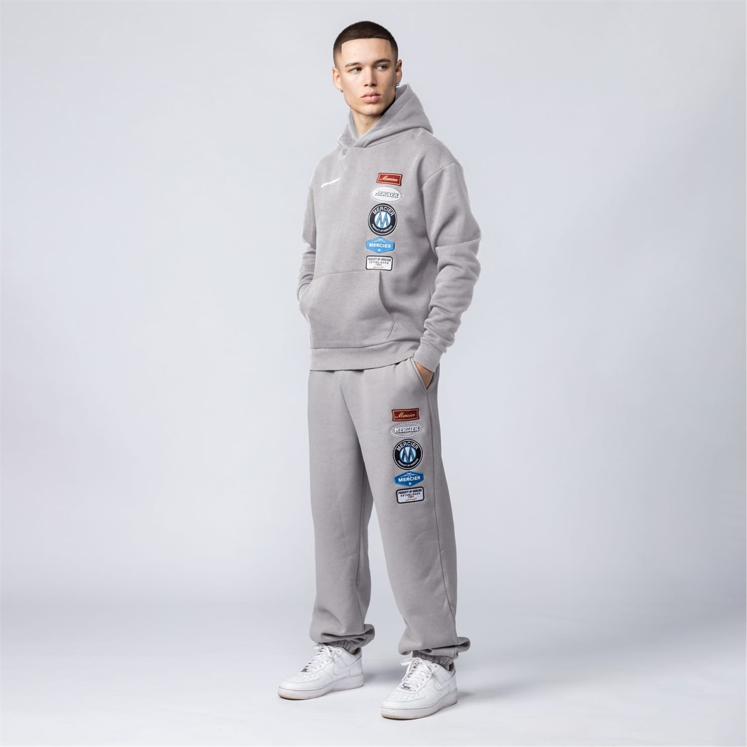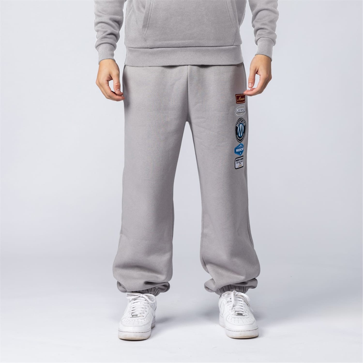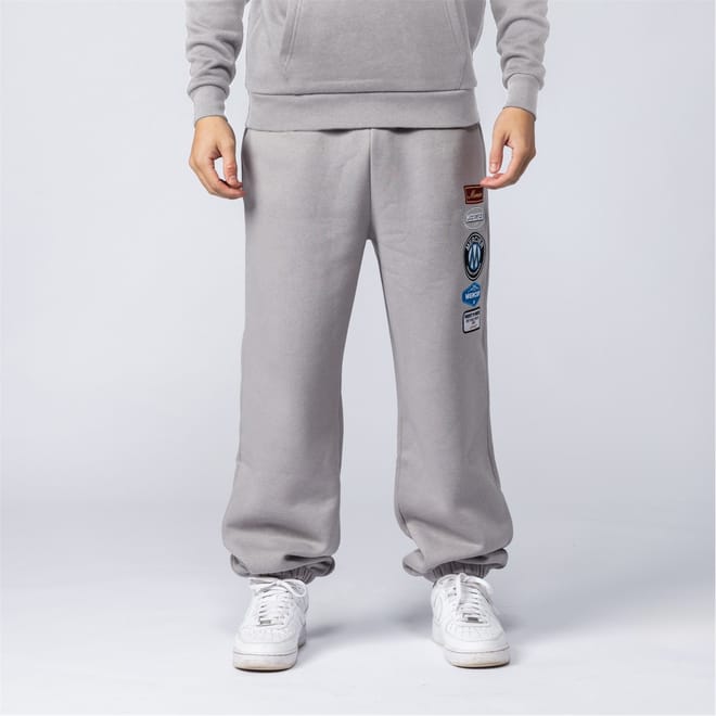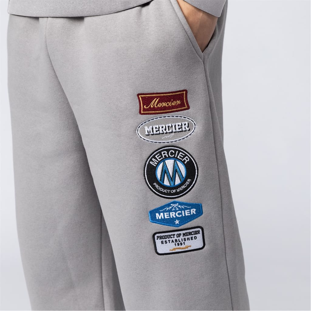 Mercier sweatpants feature a unique blend of embellishments, including a badge, patch, pocket, and embroidered details. The box print graphic adds a distinctive touch, making these sweatpants a standout choice for casual wear. -