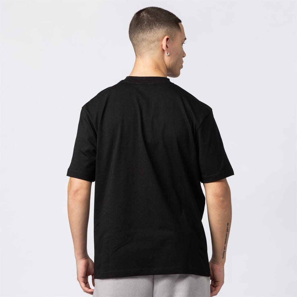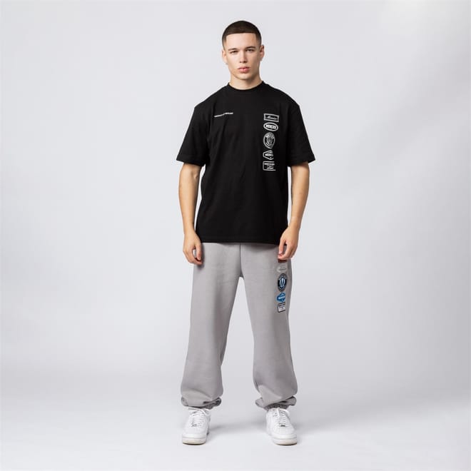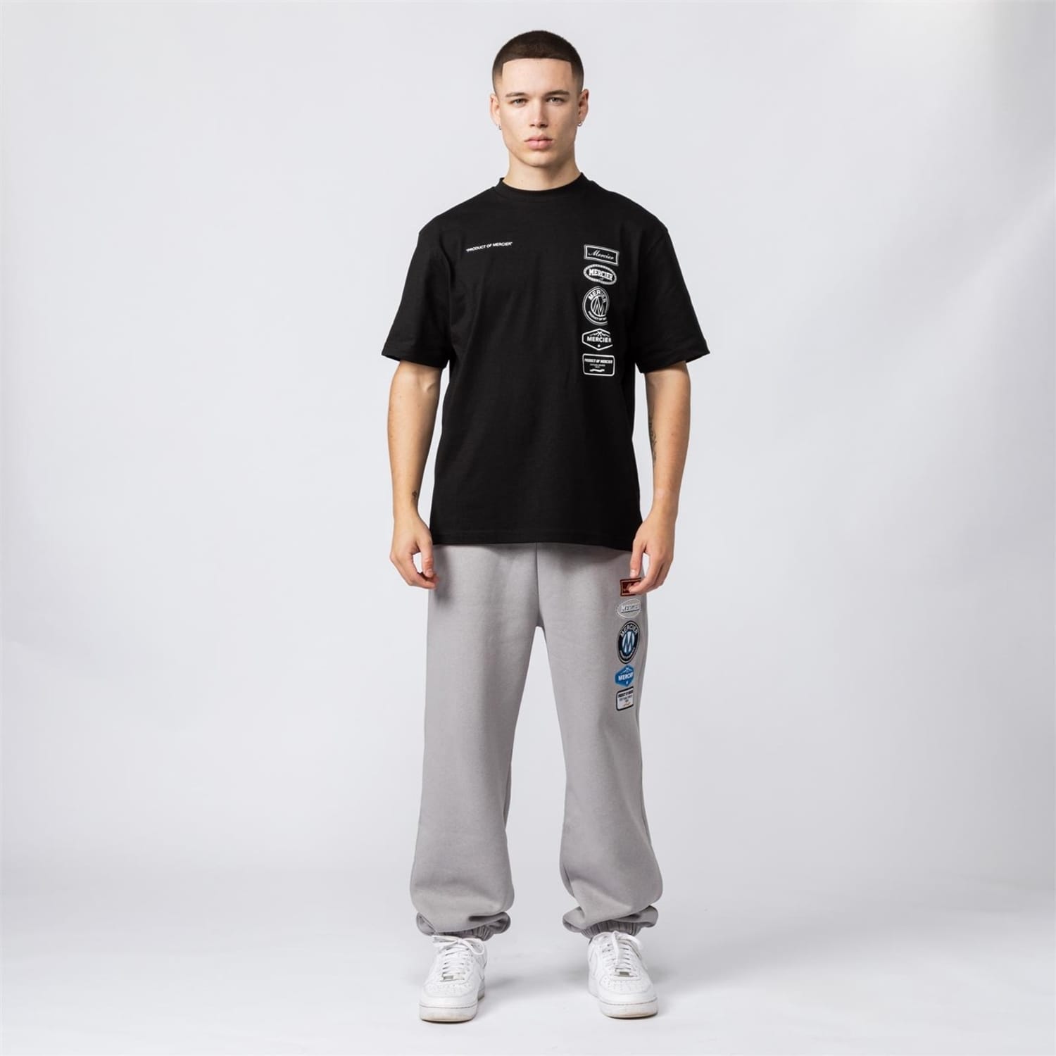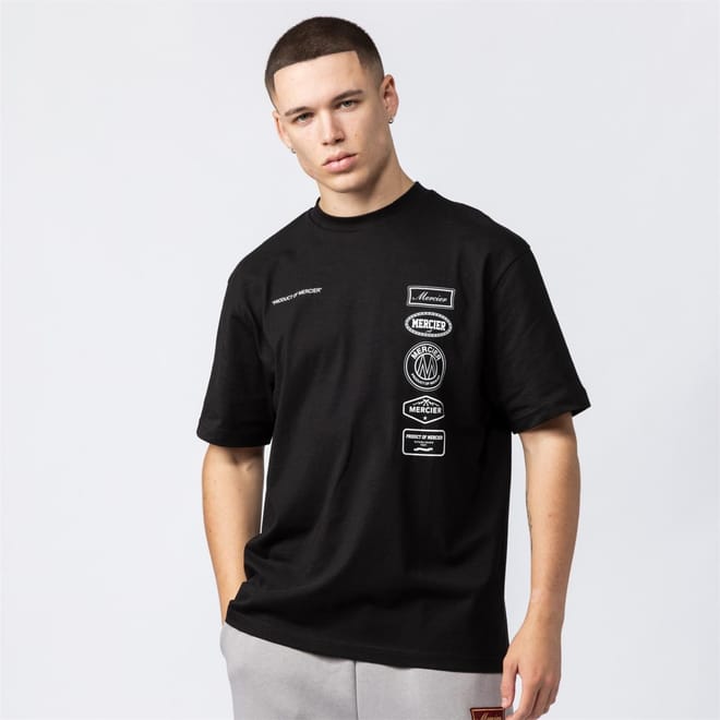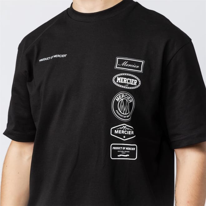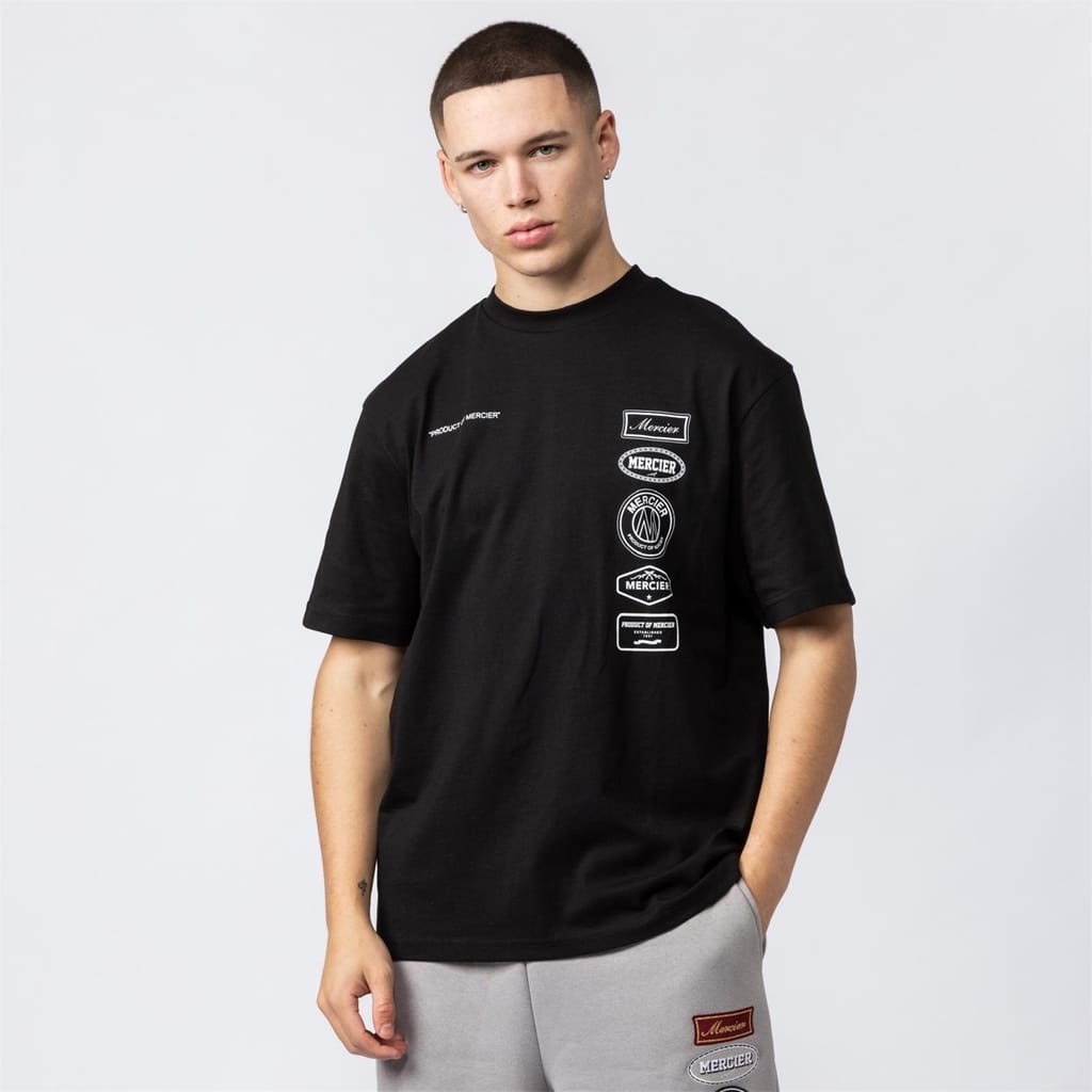 Discover Mercier's casual top, featuring an oversize fit and a crew neck. This short-sleeve design includes a drop shoulder style and a straight hem. The top is adorned with a badge and logo print, complemented by a text graphic. A ribbed collar adds a touch of detail to this versatile piece. -