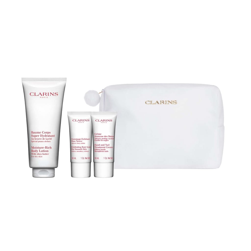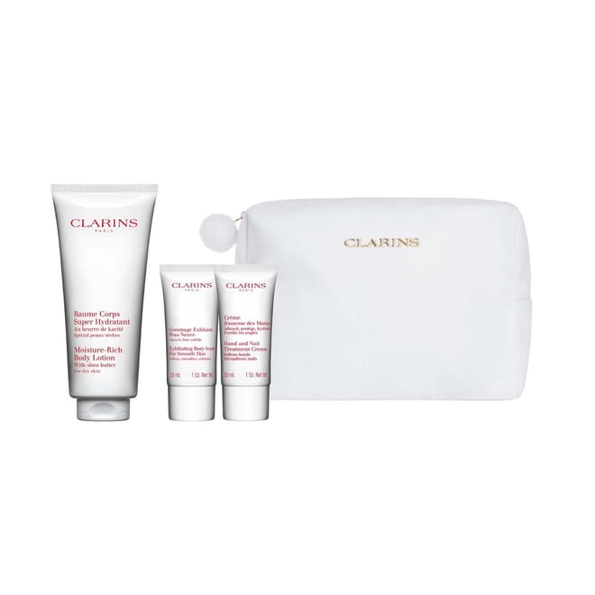 - Glow all over with Clarins Body Care Essentials - worth over £52. This pampering set includes a FULL SIZE Moisture-Rich Body Lotion (200ml) to deeply nourish and hydrate, Exfoliating Body Scrub (30ml) to refine and smooth, and our cult favourite Hand & Nail Treatment Cream (30ml) for soft, cared-for hands. -
