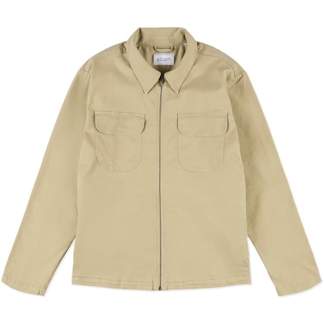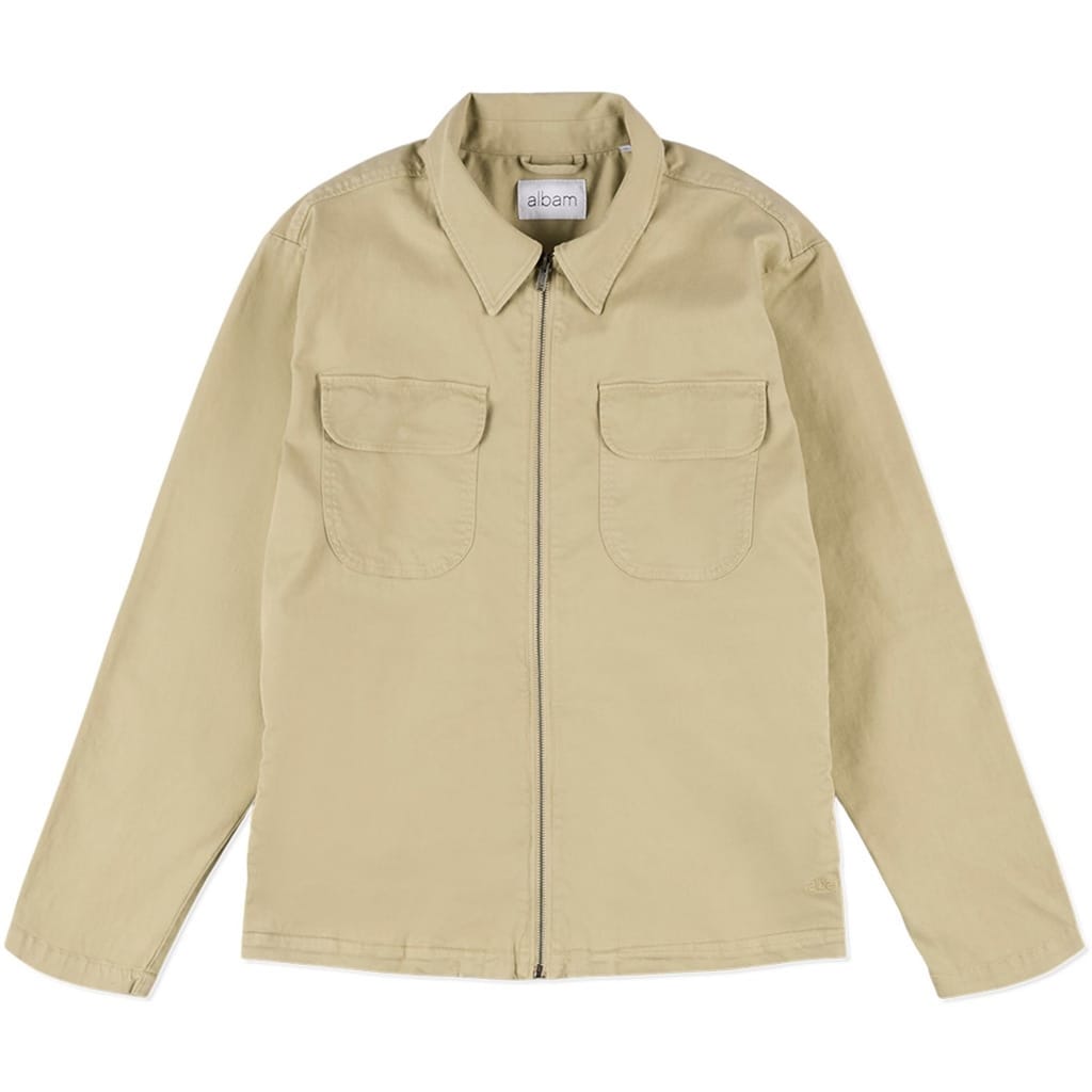 The Albam Harrington jacket features a classic shirt collar and a straight hem, offering a timeless silhouette. Crafted in a solid pattern, this short jacket is designed with a regular fit. It includes practical pockets and a secure zipper and snap button closure, making it a versatile addition to your wardrobe. -