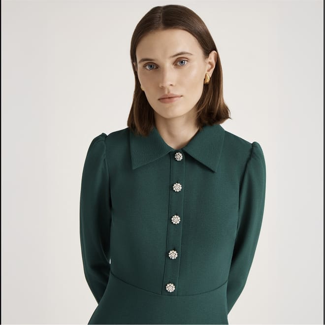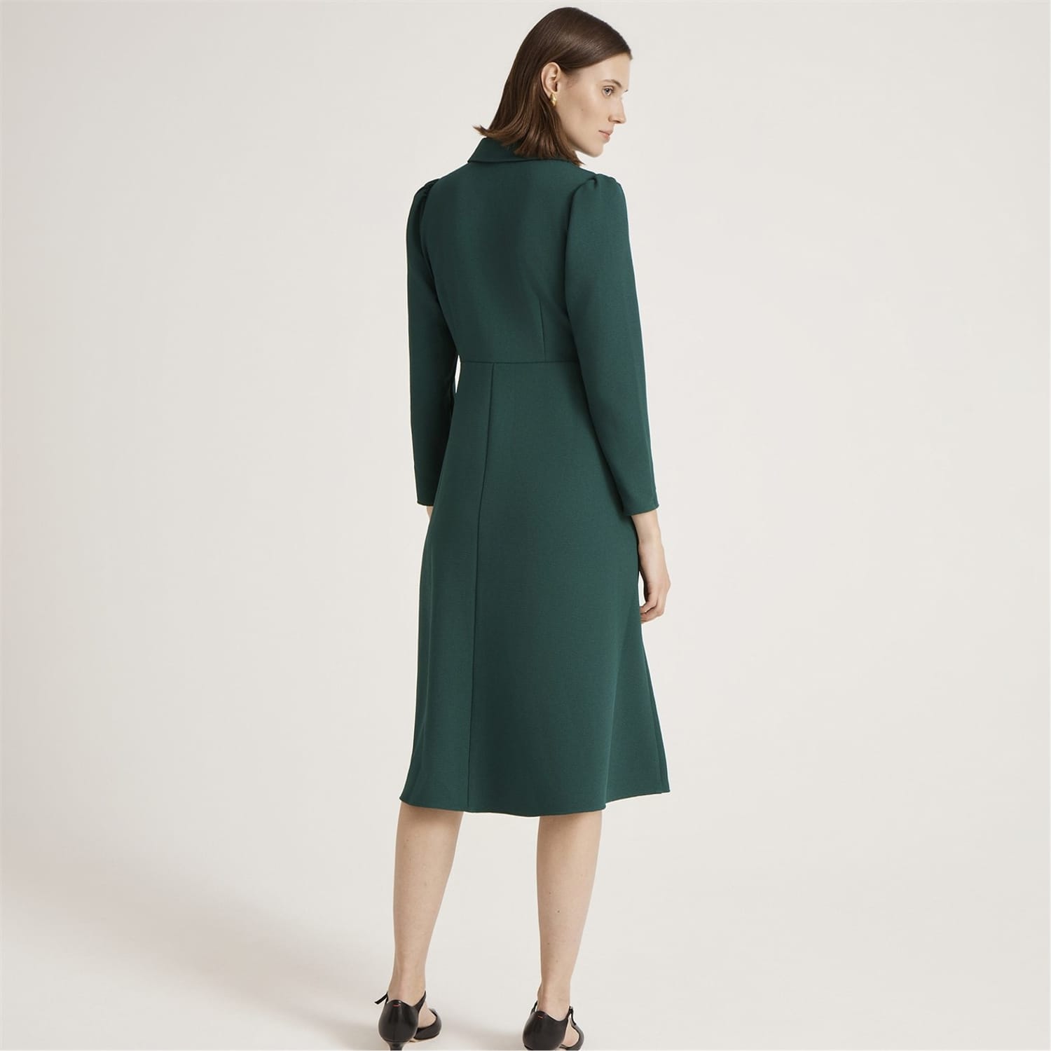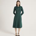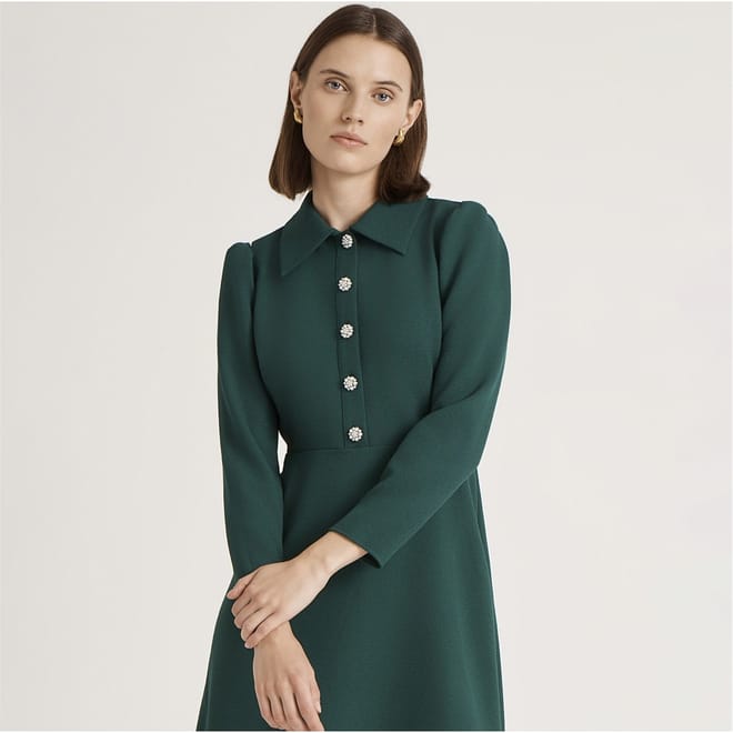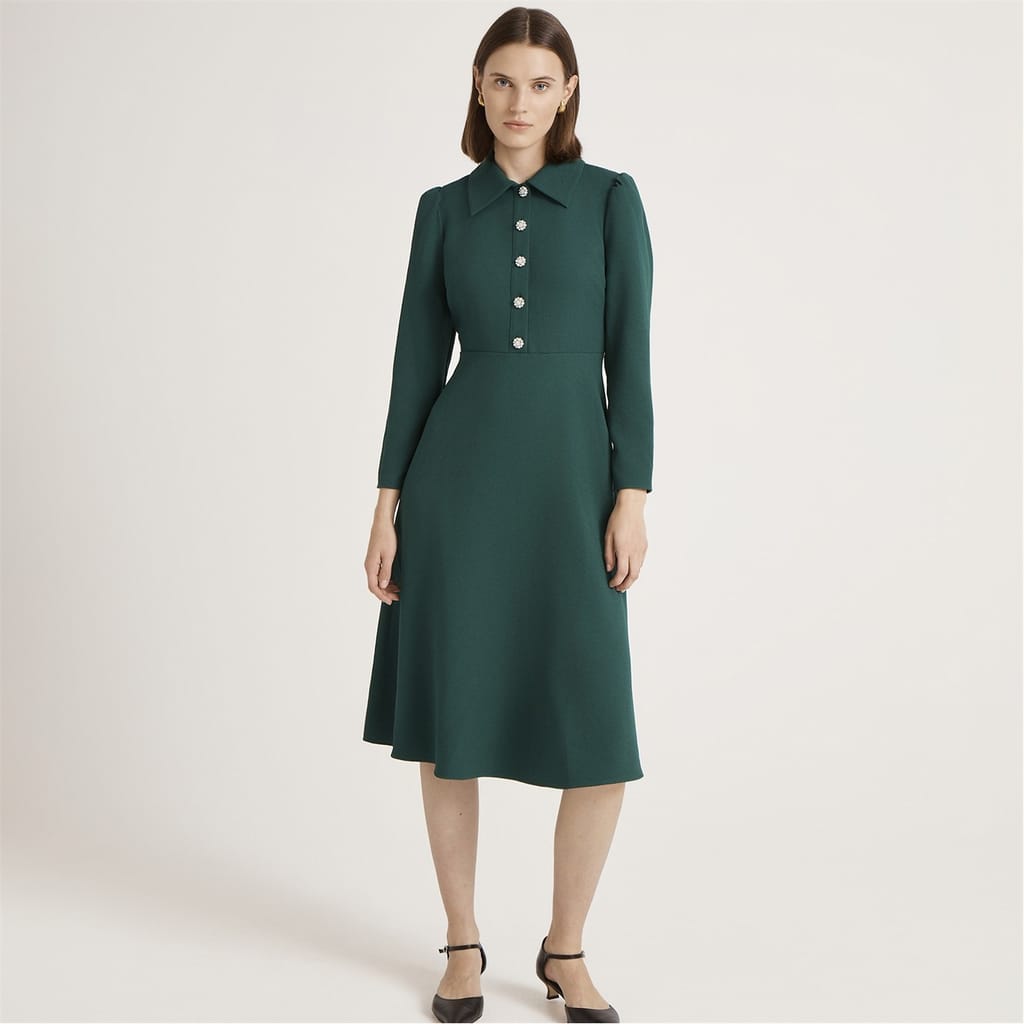 The Finery Lucia dress is a sophisticated midi A-line dress featuring a collared neck and shirt collar. Crafted with a solid pattern, it offers a regular fit and a straight hem. The dress is designed with long sleeves and a button closure, making it a versatile addition to any wardrobe. -