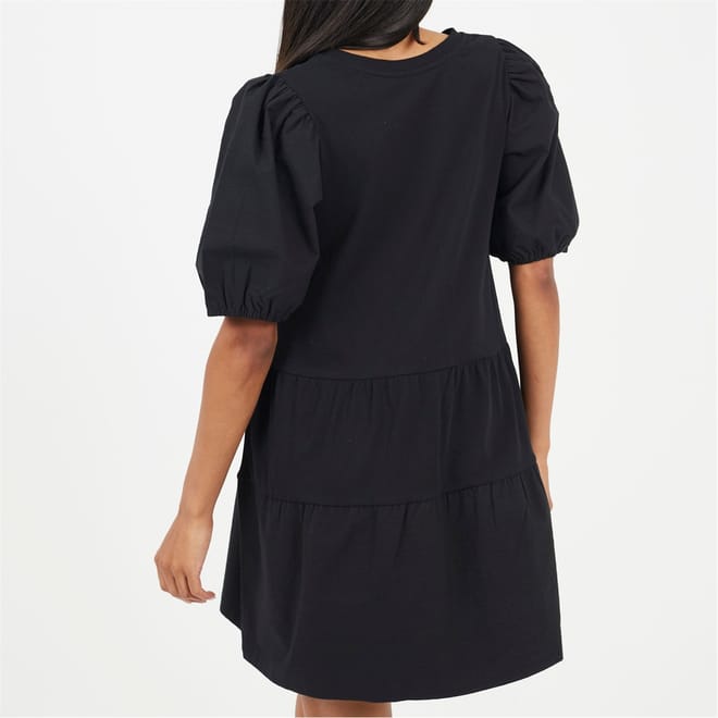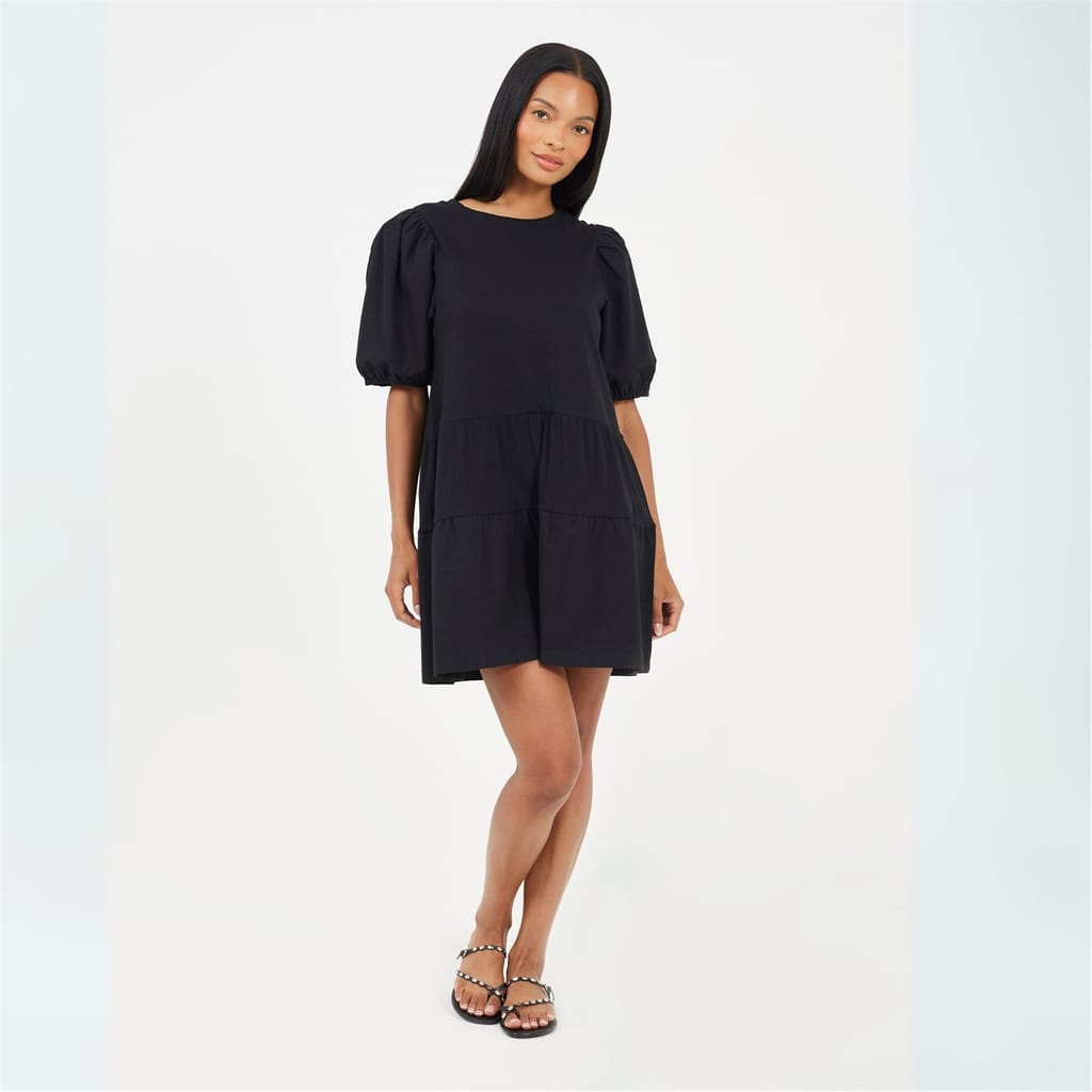 This Brave Soul mini dress is a stylish tiered dress featuring a crew neck and puff sleeves. The solid pattern and straight hemline offer a classic look, while the regular fit ensures comfort. Perfect for any occasion, this dress combines elegance with a modern twist. -