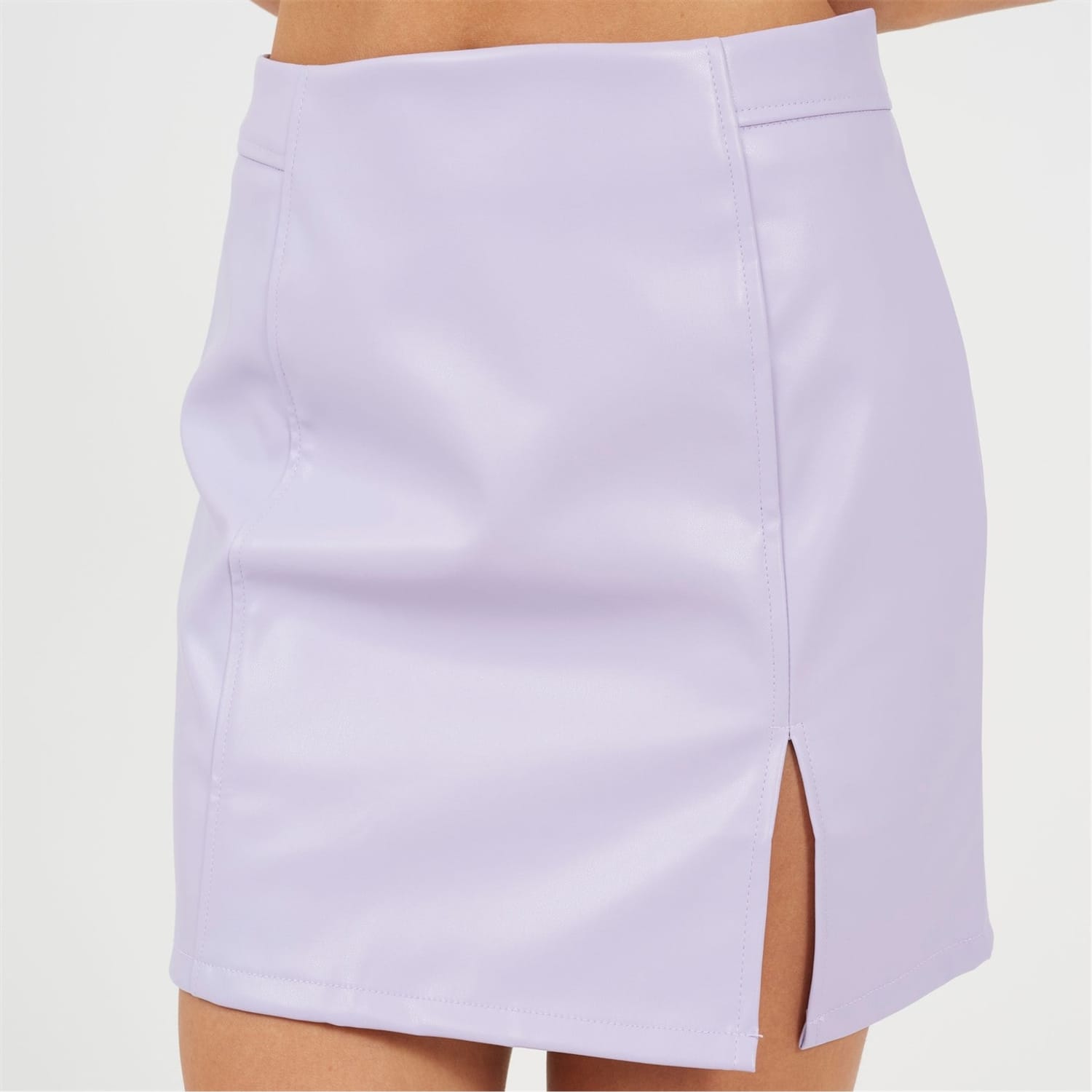 Brave Soul Women's skirt. Mini length, lilac faux leather. Split hem detail to one side, solid colourway. -
