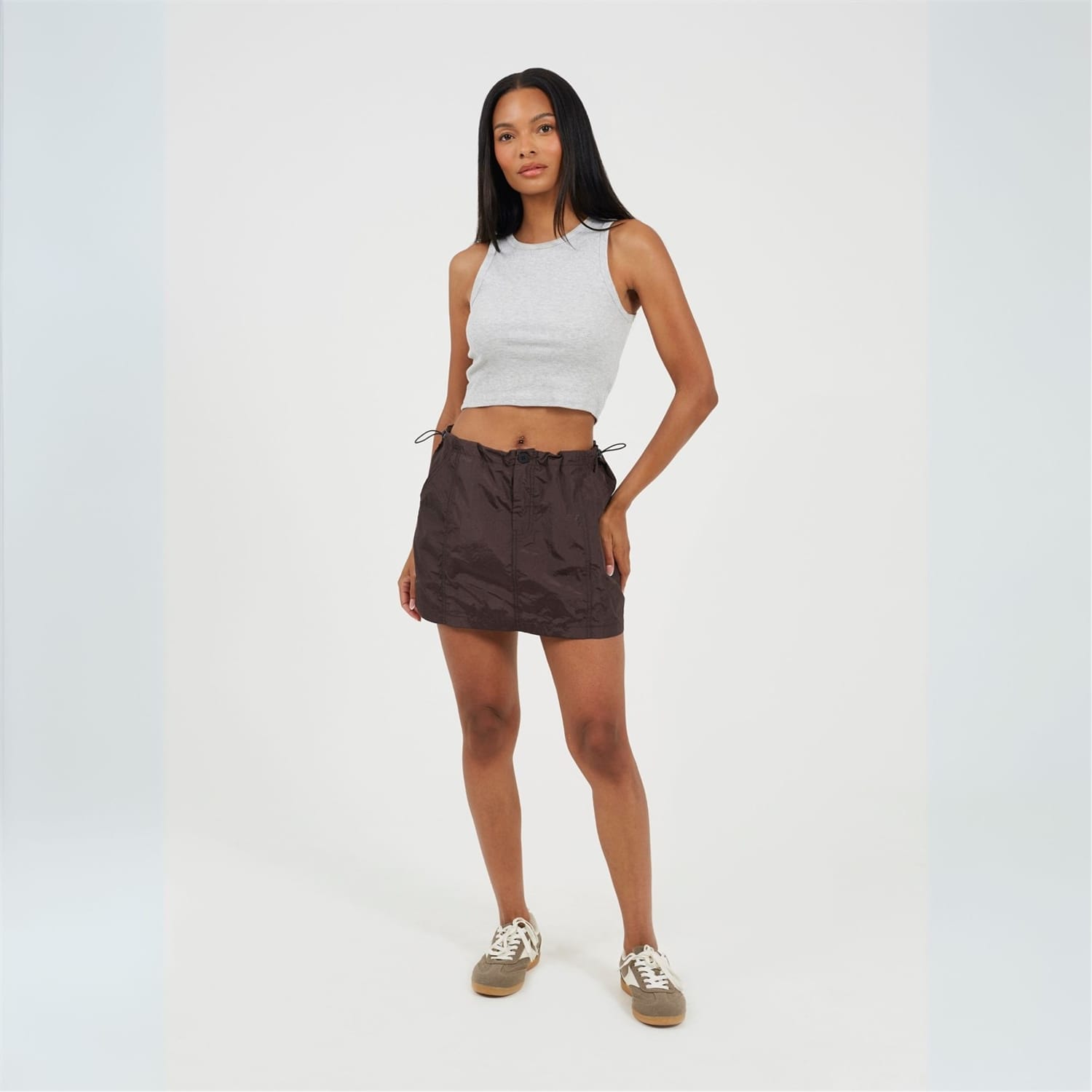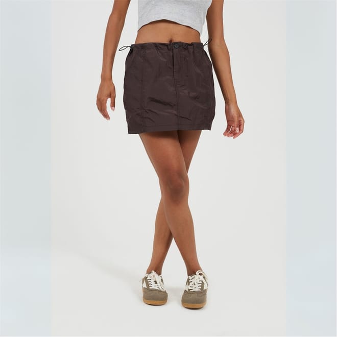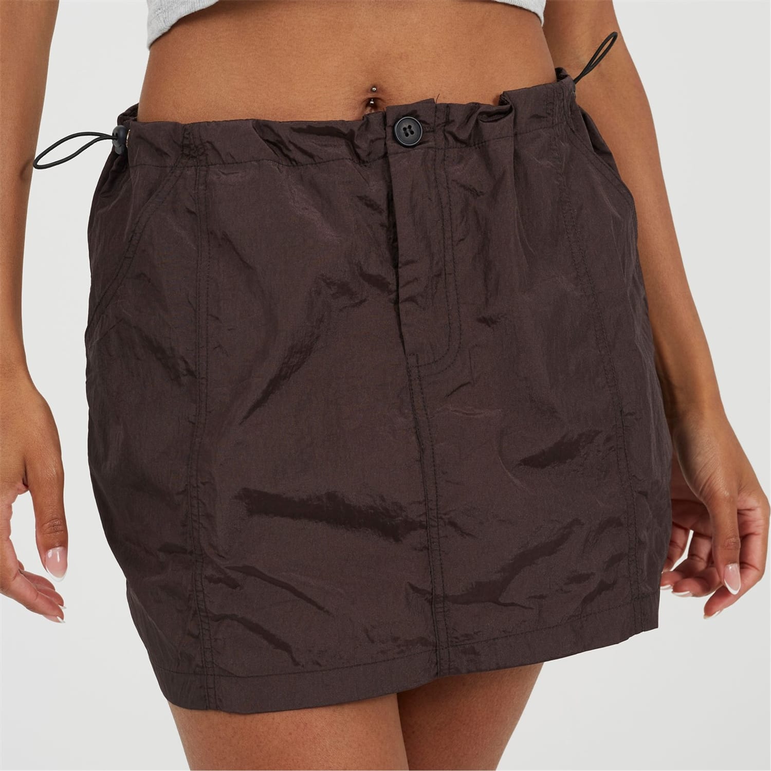 Brave Soul Women's skirt. Mini length, cargo style with front seam detail. Button and zip closure, elasticated waist with adjustable toggles. -