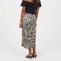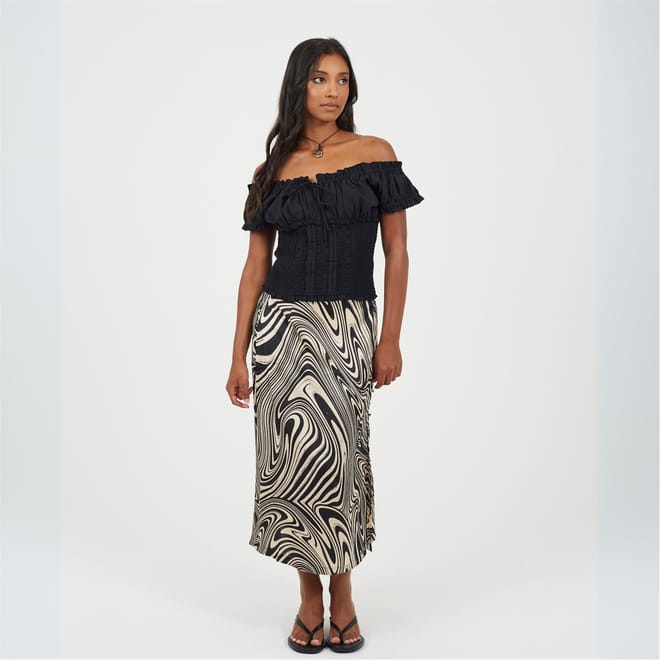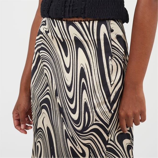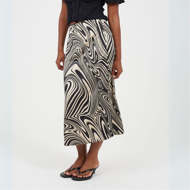 Brave Soul Womens skirt. Midi length, elasticated waist with fabric button detail to side. Side split detail, all over swirl print. -